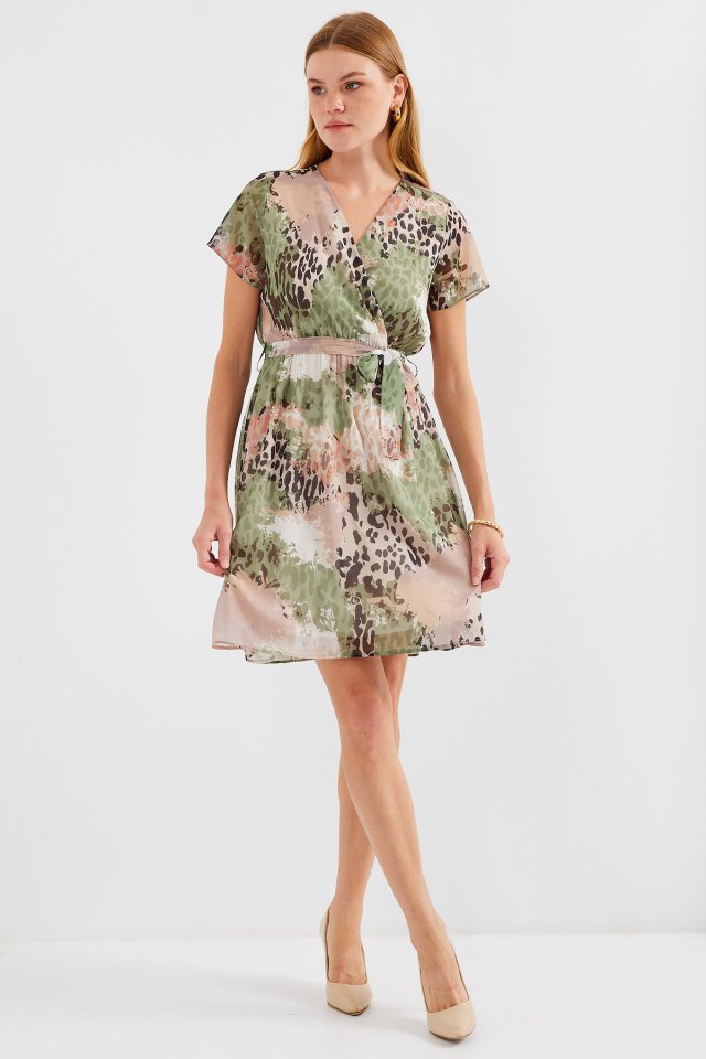 2502 Kısa Kol Desenli Şifon Elbise – Çağla