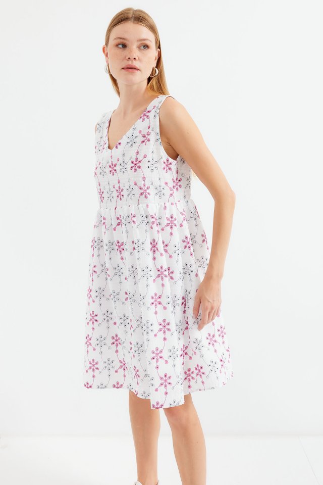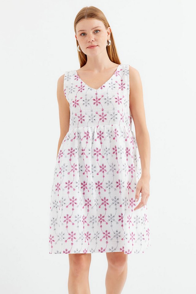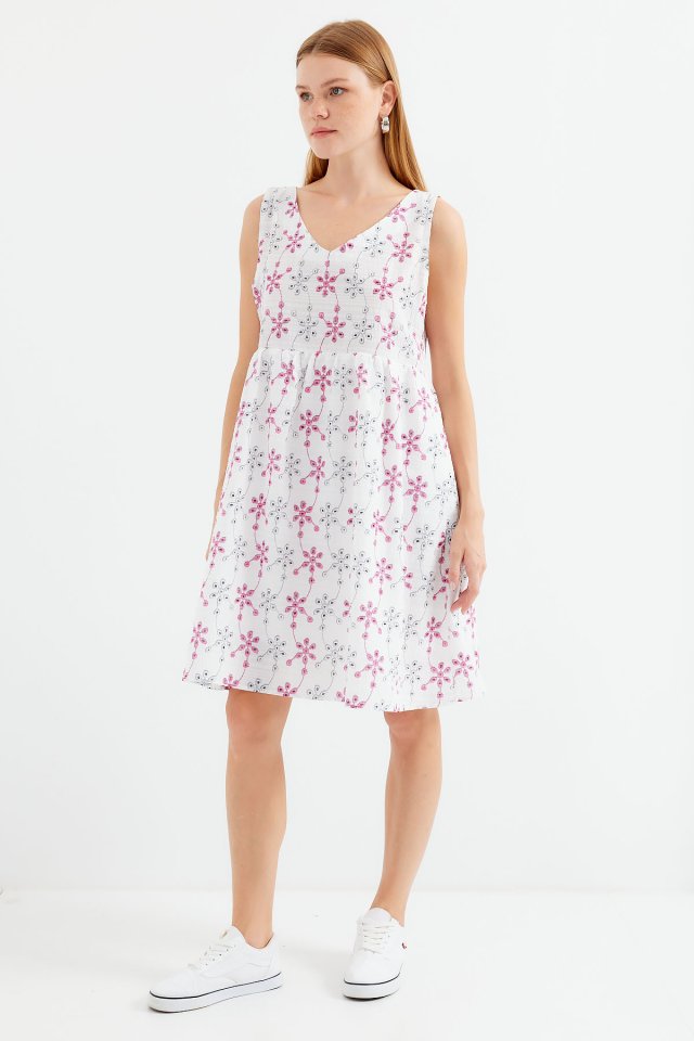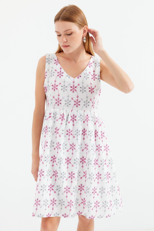 2507 V Yaka Desenli Mini Elbise – Beyaz