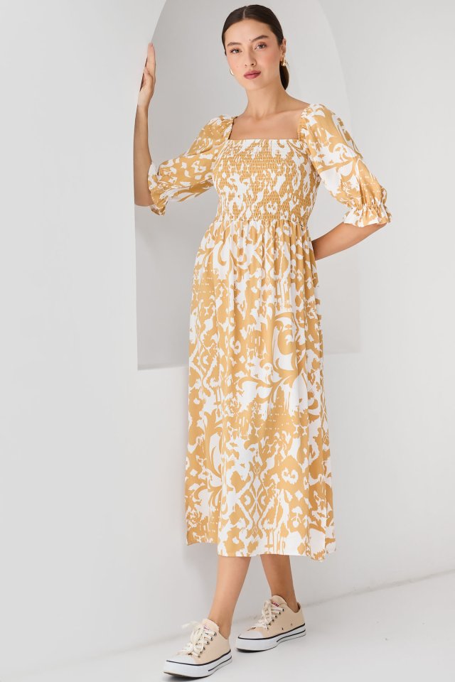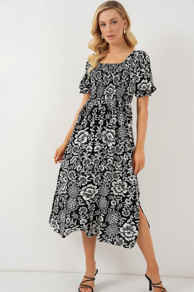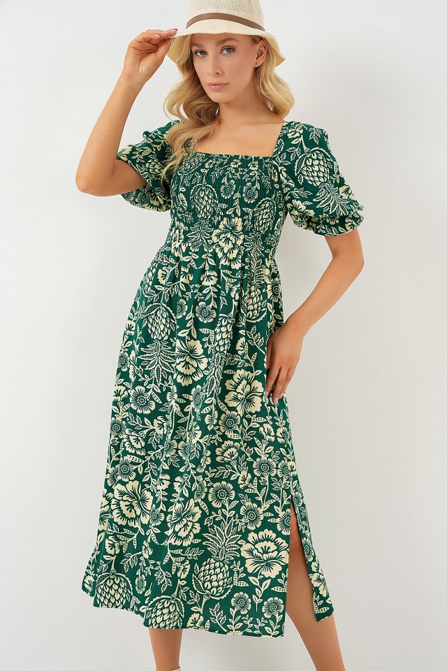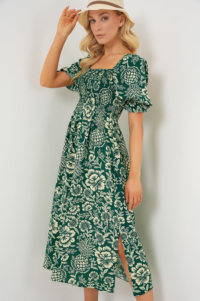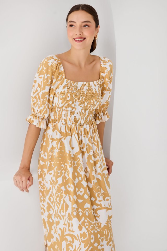 2512 Desenli Yırtmaçlı Elbise – Sarı