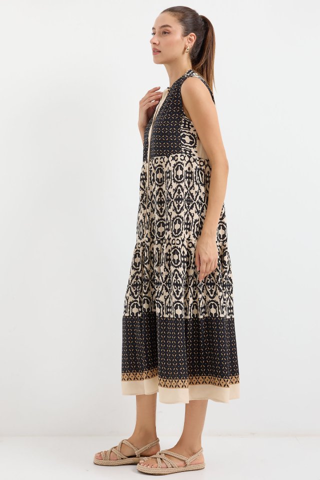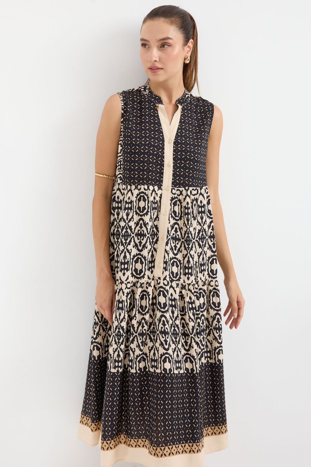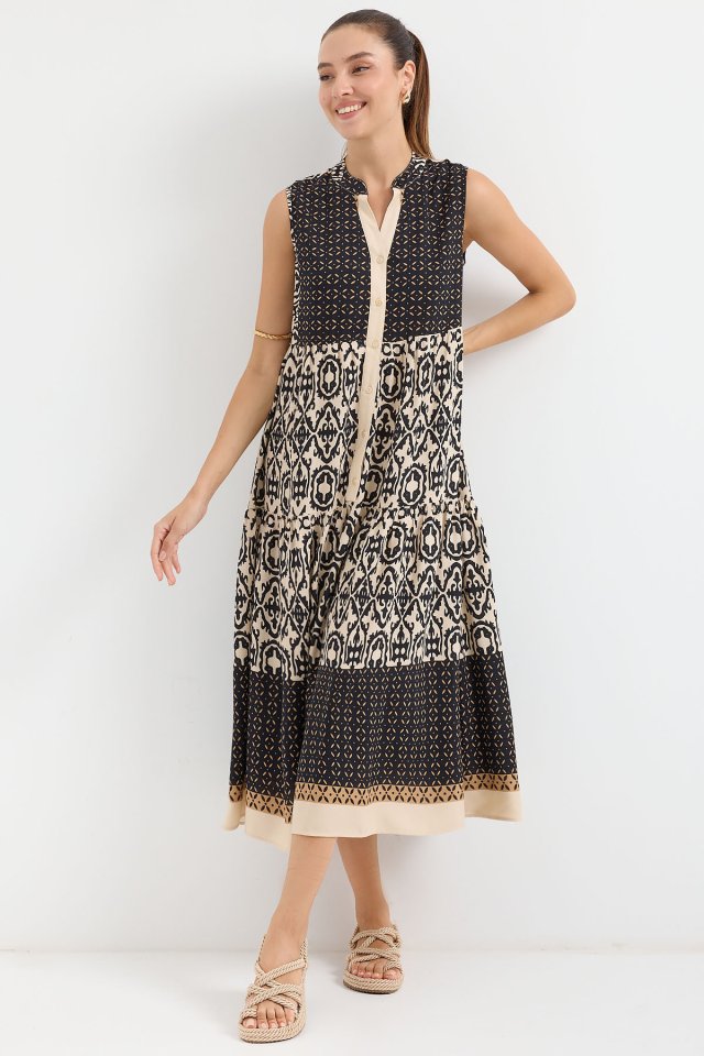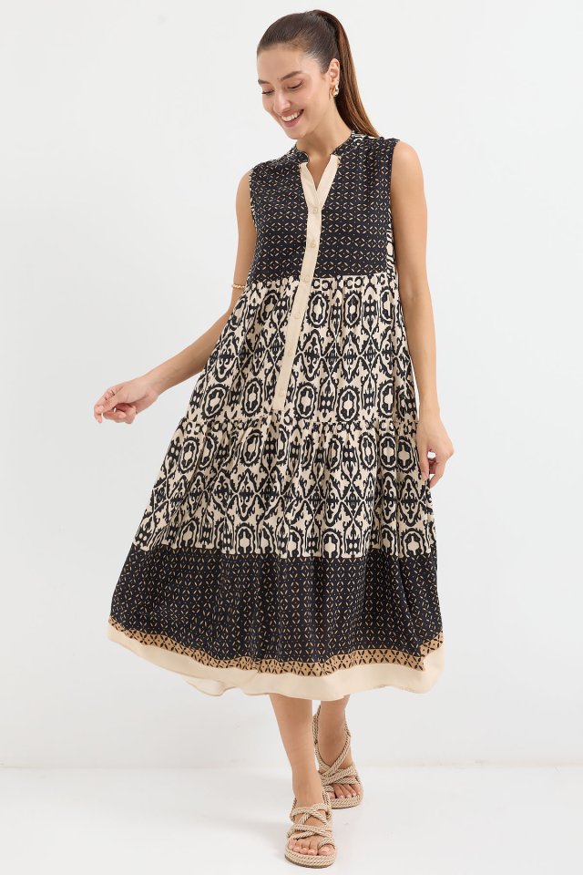 2516 Desenli Sıfır Kol Viskon Elbise – Siyah