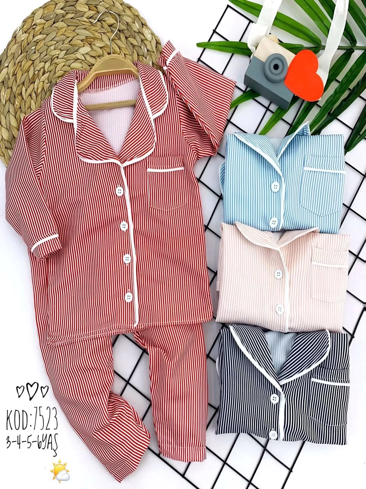 3-4-5-6 Yaş Düğme Kapamalı Boydan Çizgi Desenli 2li Kız Erkek Çocuk Pijama Takımı Pudra