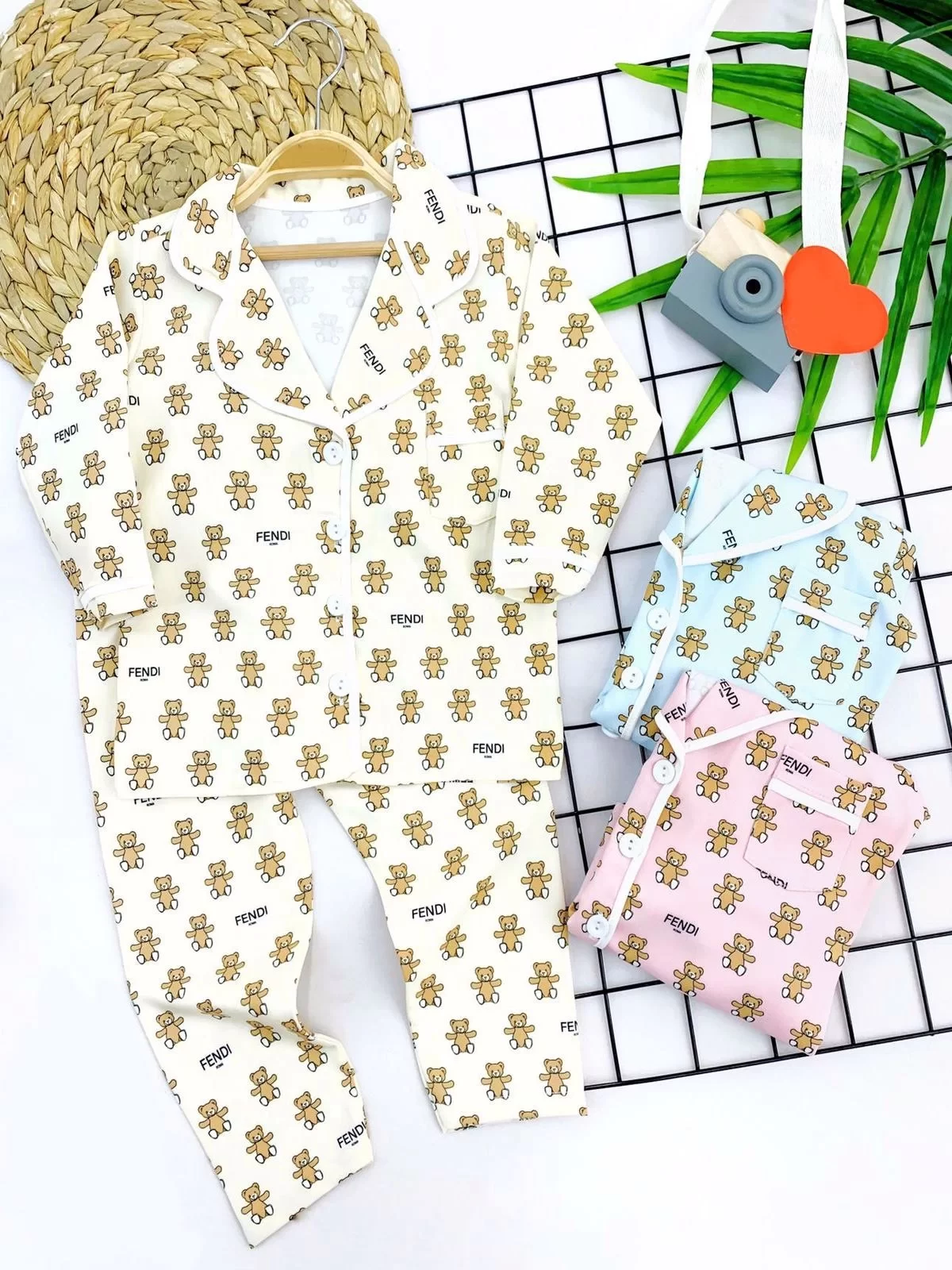 / 3-4-5-6 Yaş Fendi Baskılı Düğme Kapama 2li Kız Erkek Çocuk Pijama Takımı Pudra