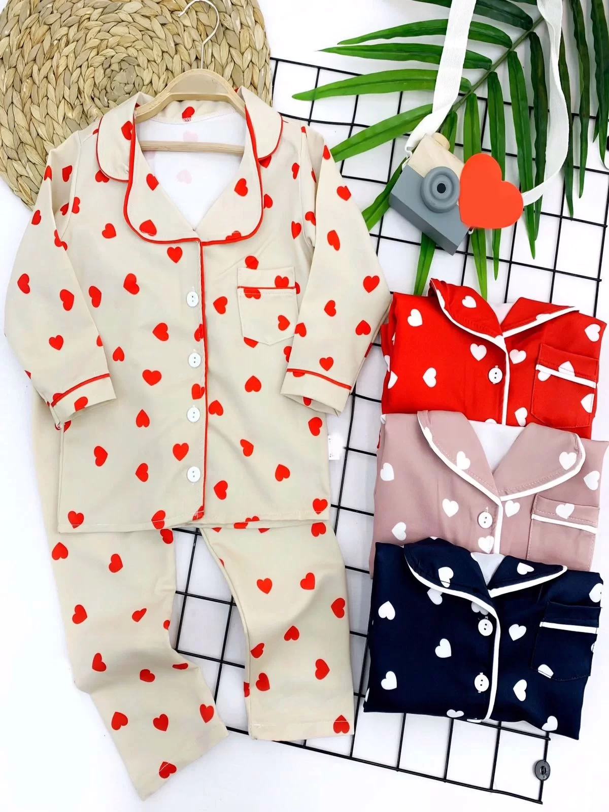 3-4-5-6 Yaş Kalp Baskılı Düğme Kapamalı 2li Kız Çocuk Pijama Takımı Kırmızı adet