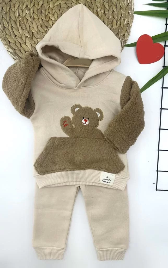 3-4-5-6 Yaş Kapşonlu Welsoft Ayıcık Nakışlı Uzun Kollu 2li Kız Erkek Çocuk Takımı