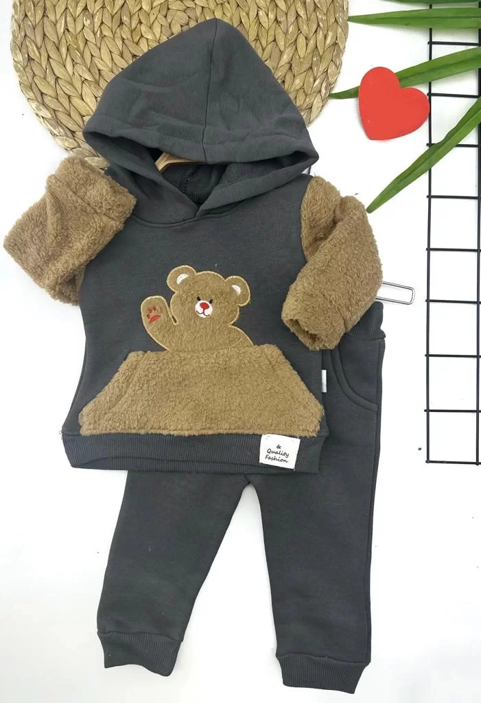 3-4-5-6 Yaş Kapşonlu Welsoft Ayıcık Nakışlı Uzun Kollu 2li Kız Erkek Çocuk Takımı Gri