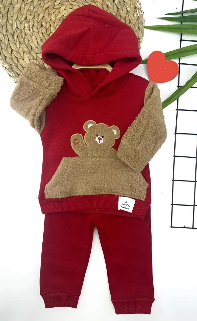 3-4-5-6 Yaş Kapşonlu Welsoft Ayıcık Nakışlı Uzun Kollu 2li Kız Erkek Çocuk Takımı Kırmızı