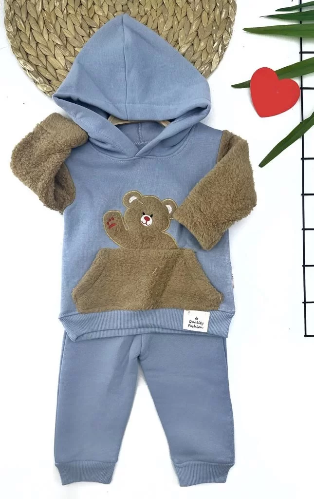 3-4-5-6 Yaş Kapşonlu Welsoft Ayıcık Nakışlı Uzun Kollu 2li Kız Erkek Çocuk Takımı Mavi