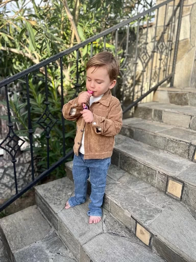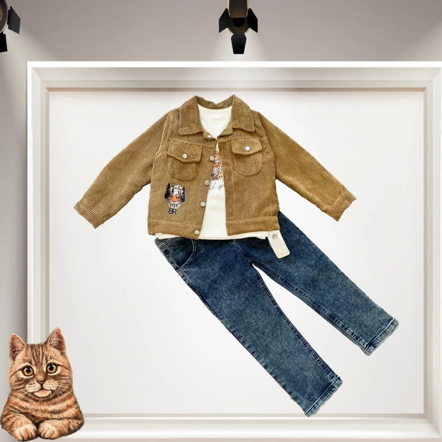 3-4-5 Yaş Fitilli Kadife Ceket Kot Pantolonlu 3lü Kız Erkek Çocuk Takımı Bej