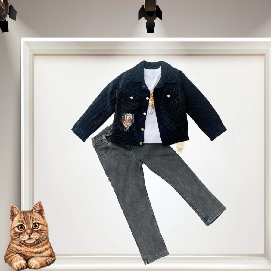 3-4-5 Yaş Fitilli Kadife Ceket Kot Pantolonlu 3lü Kız Erkek Çocuk Takımı Siyah