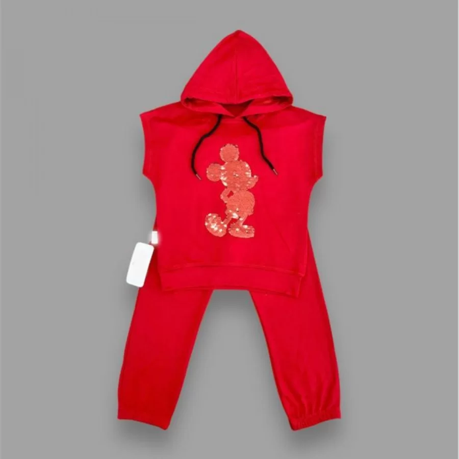 3-4-5 Yaş Kapşonlu Payetli Mickey Desenli Kısa Kol 2li Kız Erkek Çocuk Takımı Kırmızı