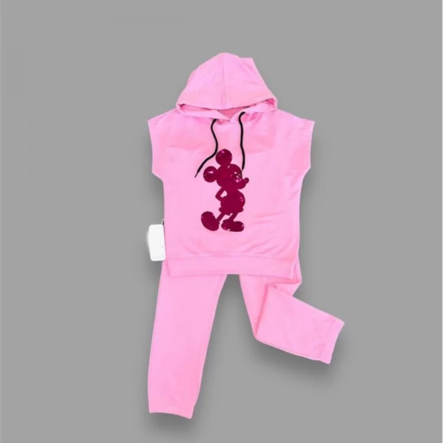 3-4-5 Yaş Kapşonlu Payetli Mickey Desenli Kısa Kol 2li Kız Erkek Çocuk Takımı Pembe