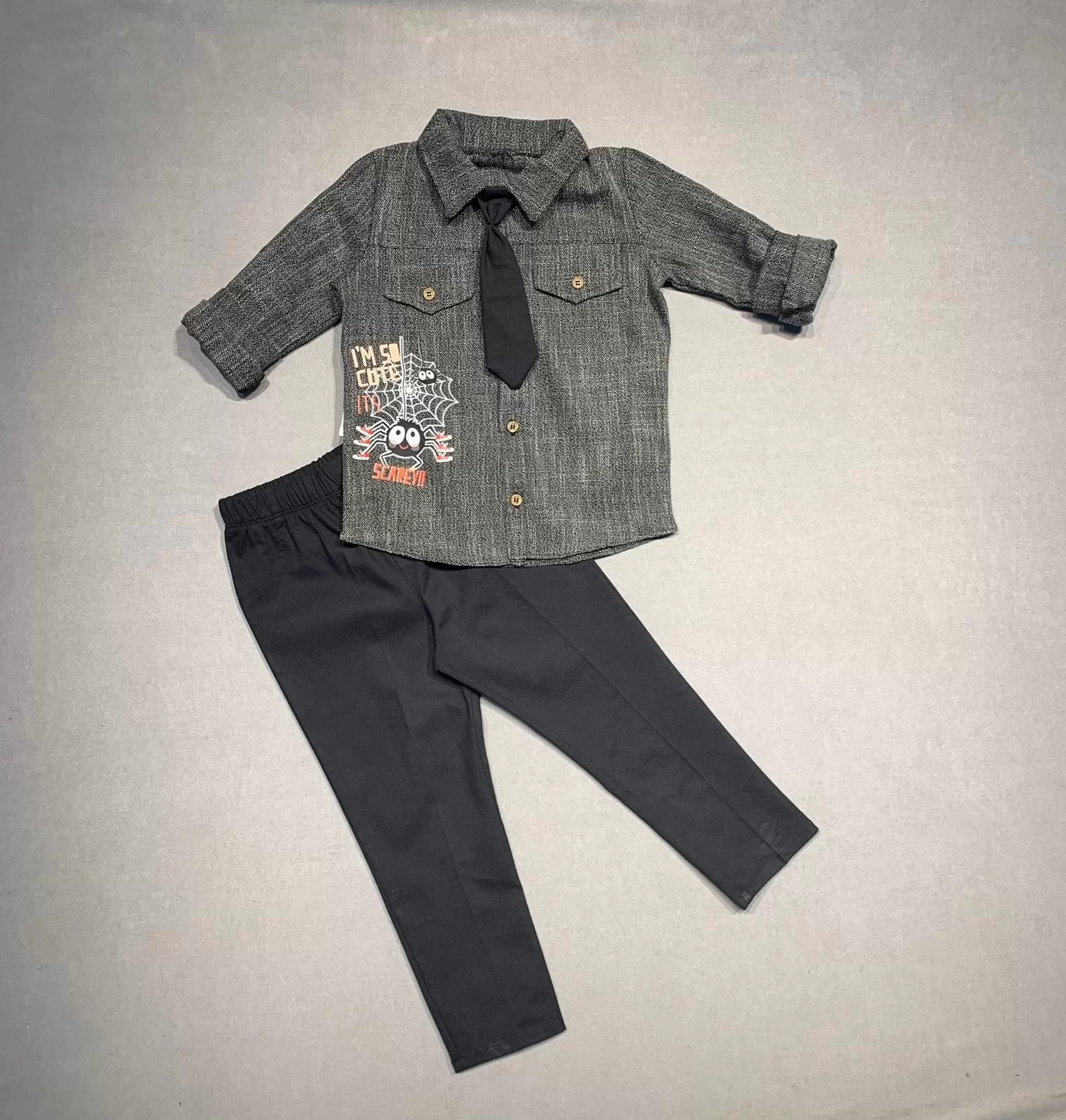 3-4-5 Yaş Kravatlı Keten Gömlek Gabardin Pantolon Uzun Kollu 3lü Erkek Çocuk Takımı Siyah