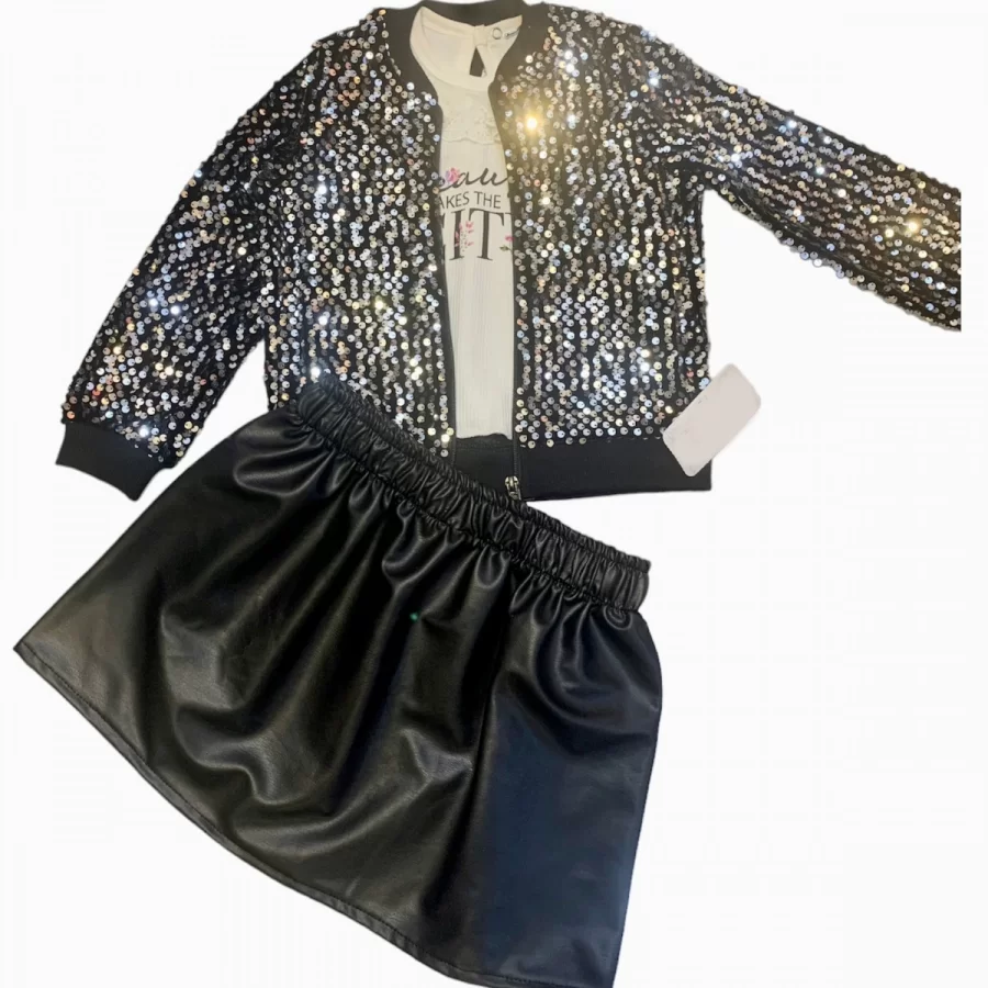 3-4-5 Yaş Payetli Ceket Deri Etek 3lü Kız Çocuk Takımı Siyah adet