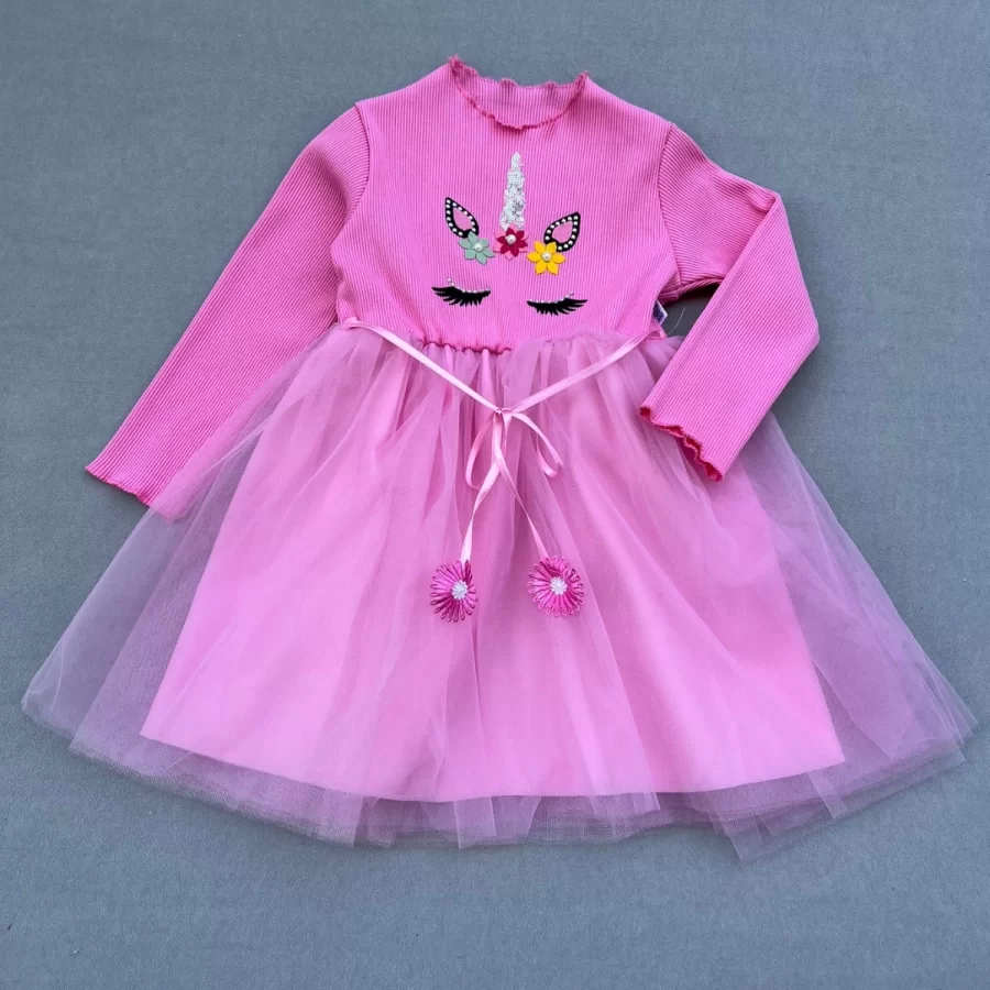 3-4-5 Yaş Taşlı Pony Figürlü Uzun Kollu Astarlı Tütü Etekli Kız Çocuk Elbisesi Pembe