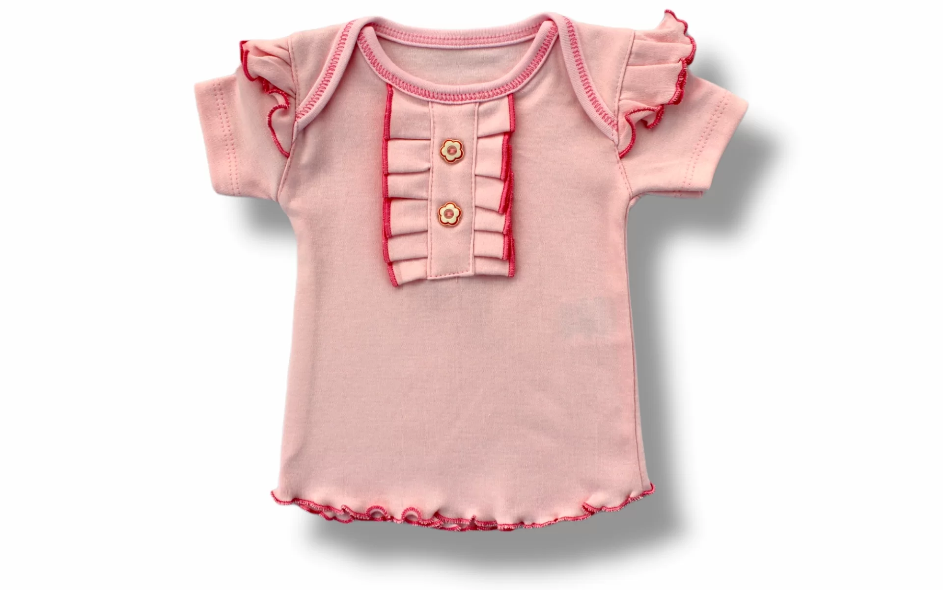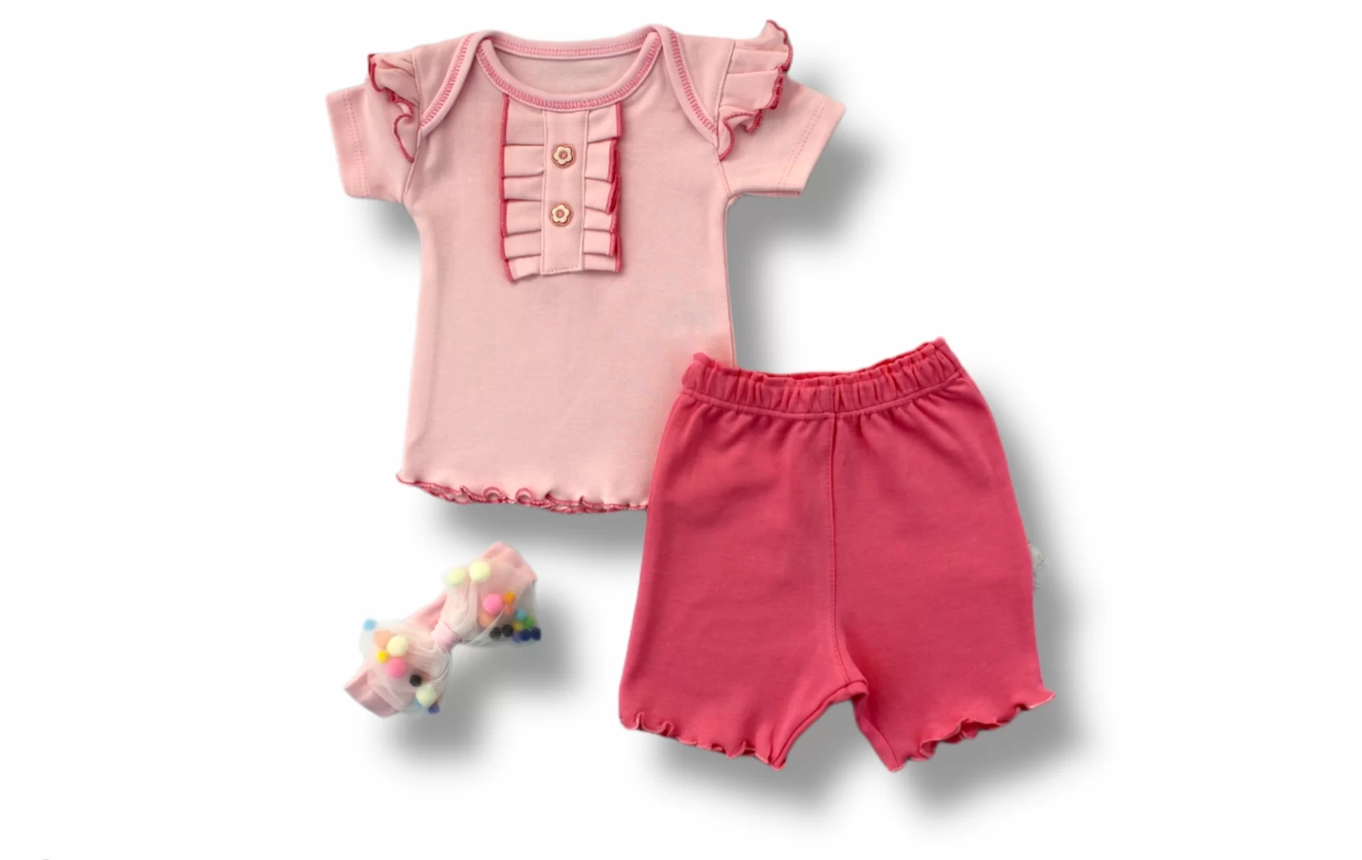 3-6 6-9 9-12 12-18 Ay Düğme Detaylı Bandanalı Kısa Kollu Sweat 3lü Kız Bebek Takımı Pudra