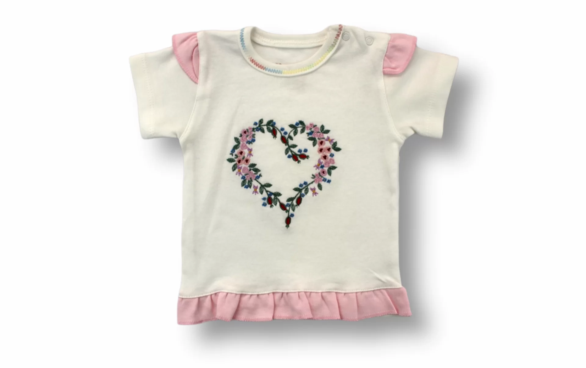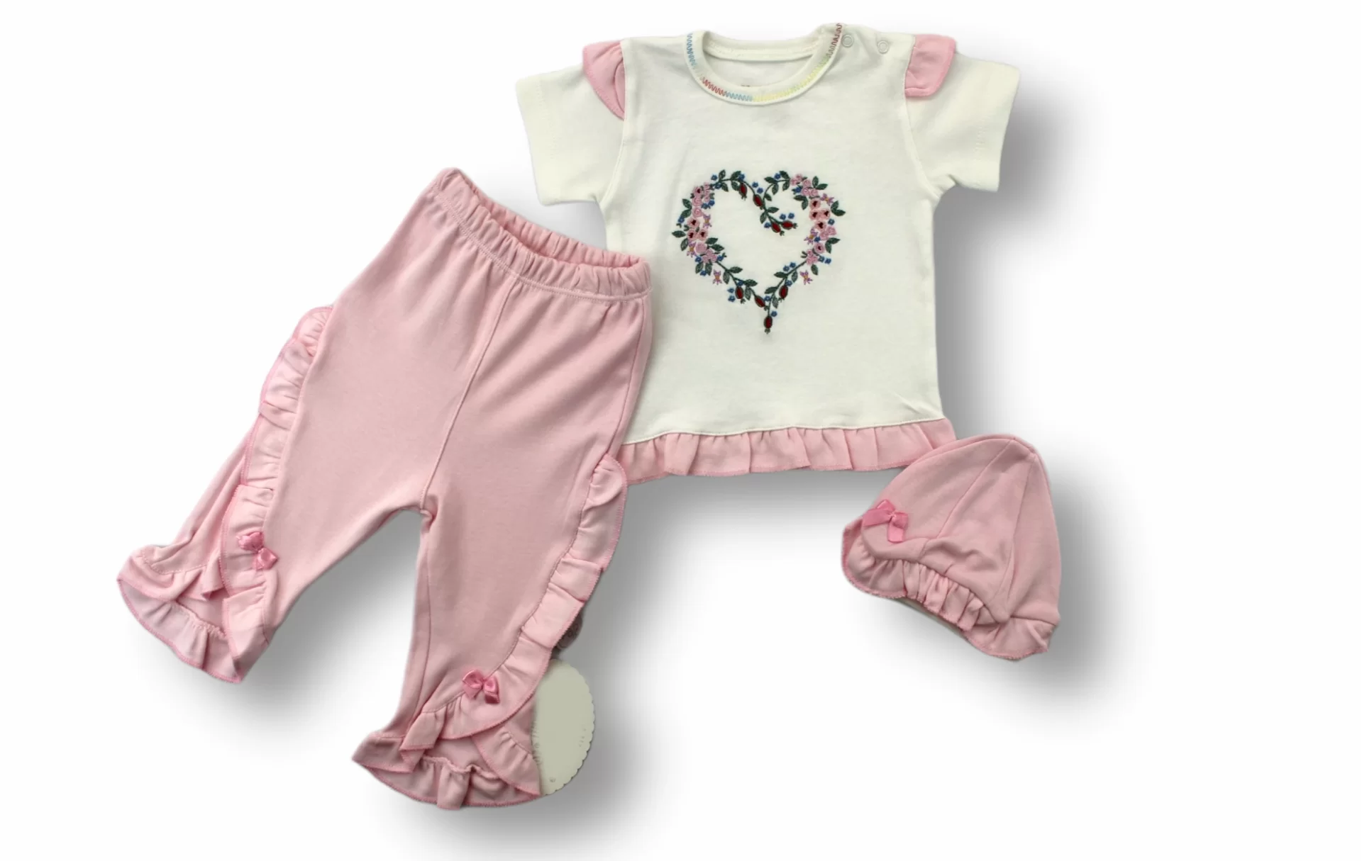 3-6 6-9 9-12 Ay Anadolu Çiçeği Nakışlı Şapkalı Kısa Kollu Sweatli 3lü Kız Bebek Takımı Pembe