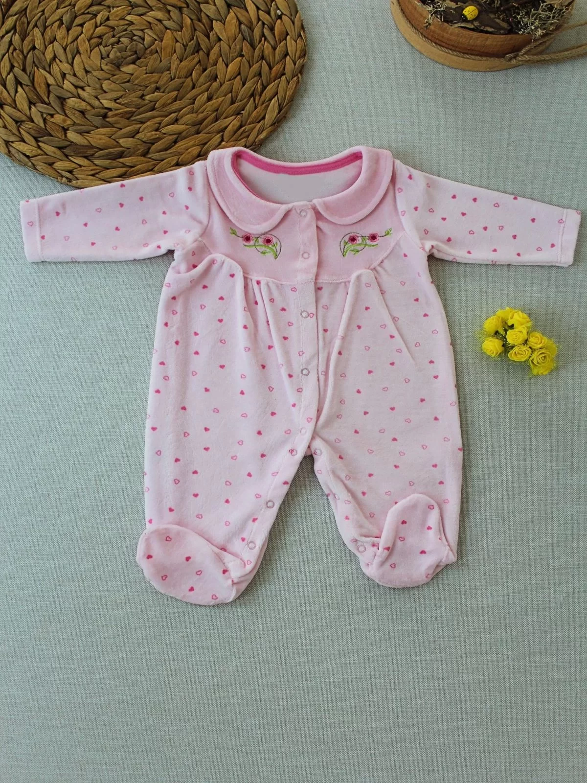 / 3-6 6-9 9-12 Ay Çiçek Nakışlı Kalp Desenli Kadife Kumaş Kız Bebek Tulumu Pembe