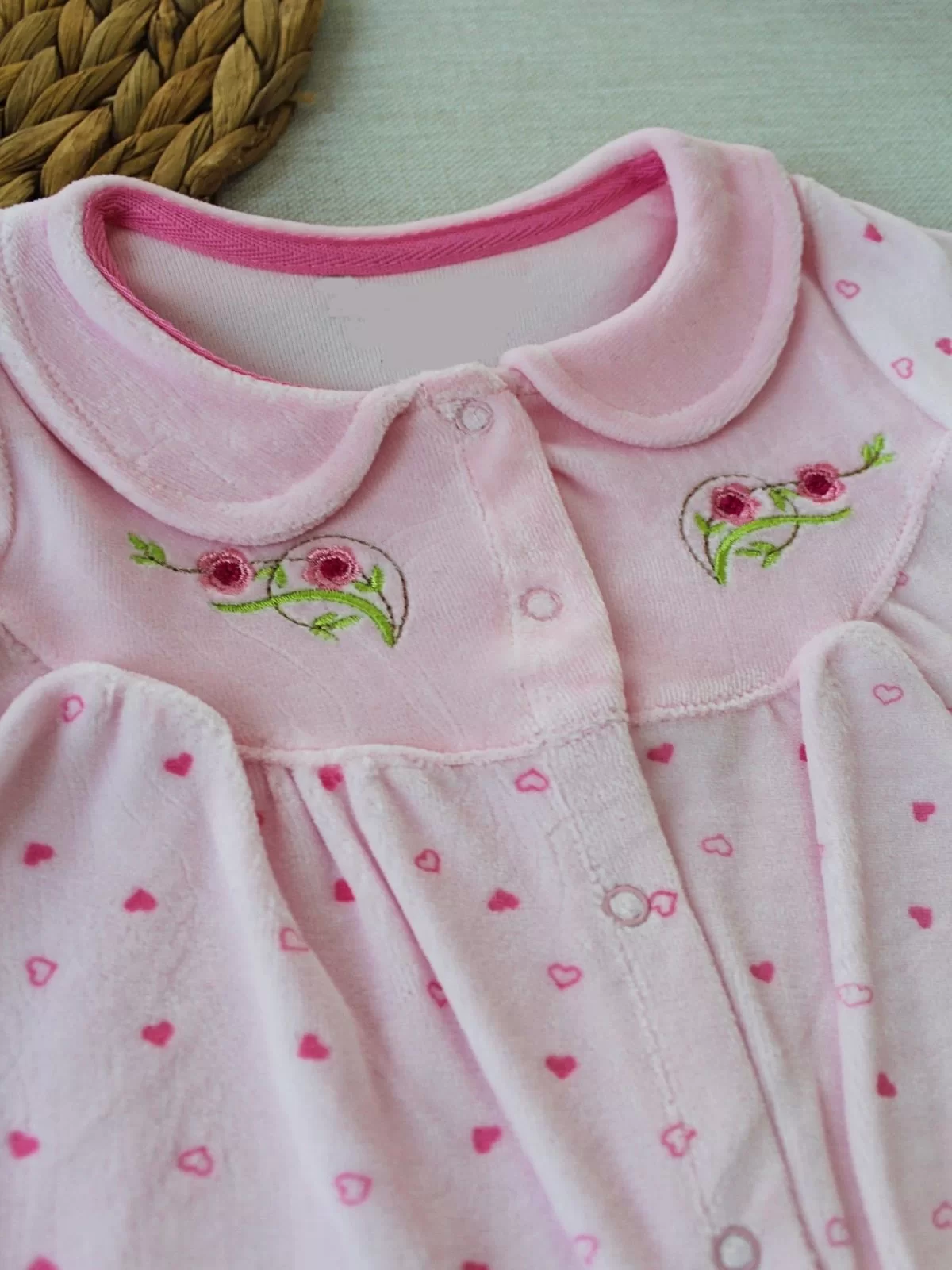 3-6 6-9 9-12 Ay Çiçek Nakışlı Kalp Desenli Kadife Kumaş Kız Bebek Tulumu Pembe