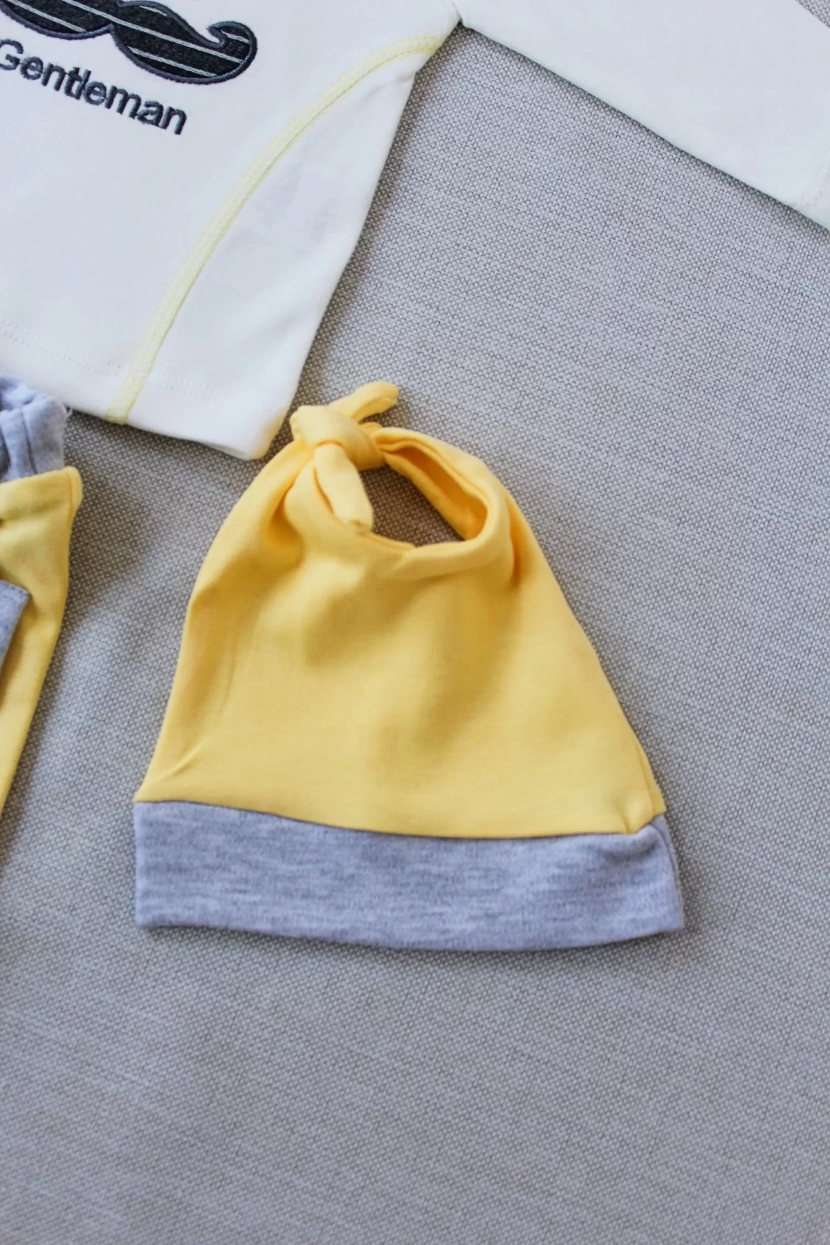3-6 6-9 9-12 Ay Gentleman Erkek Nakışlı Şapkalı Uzun Kollu Sweat 3lü Erkek Bebek Takımı Sarı