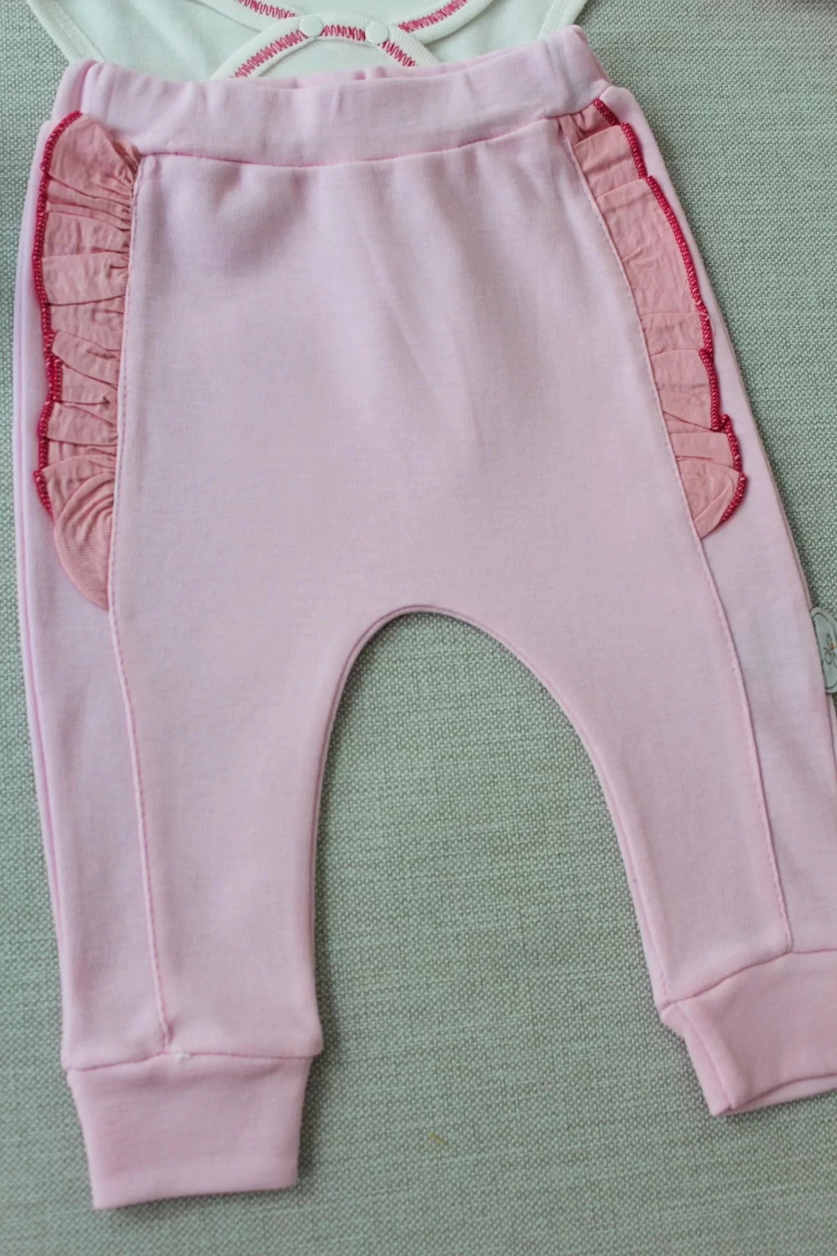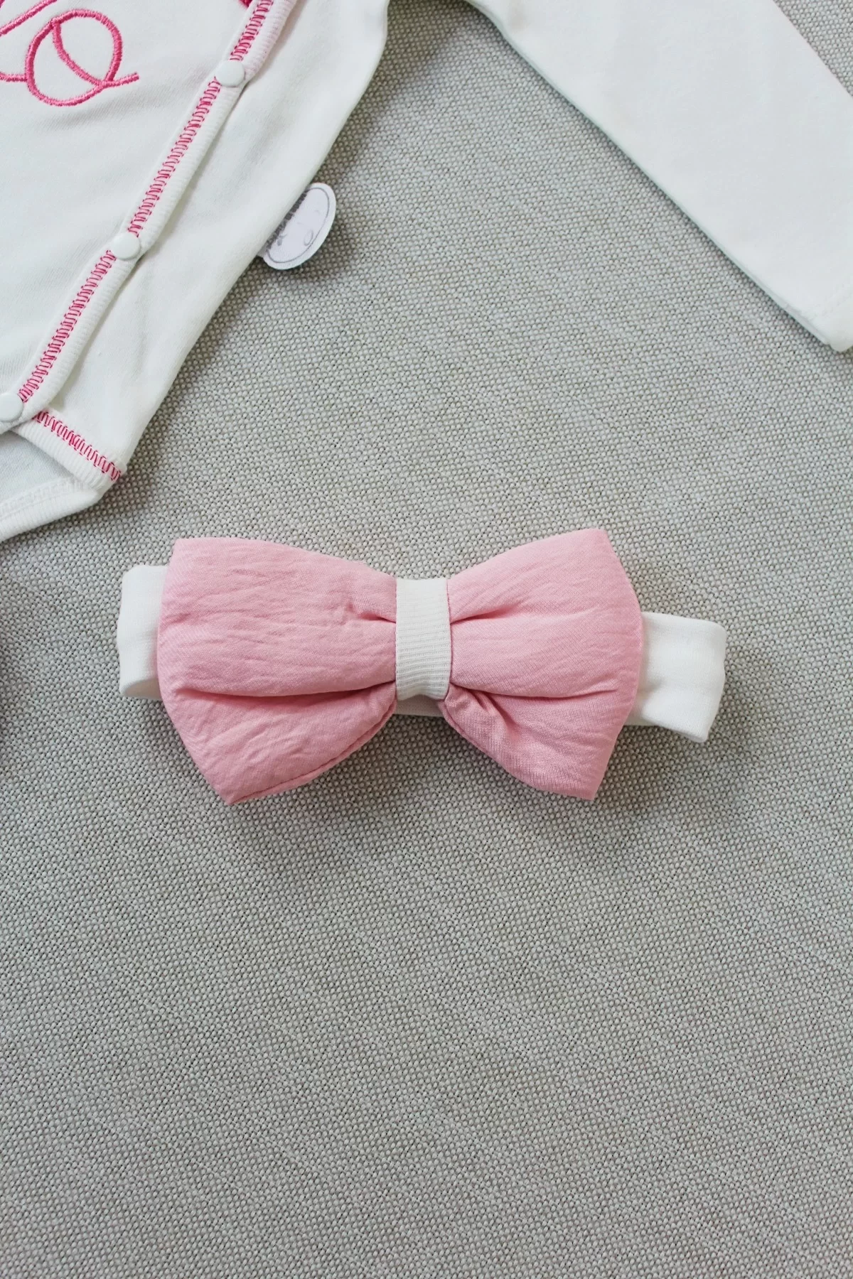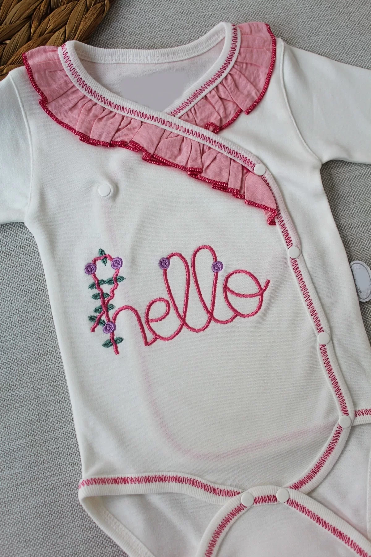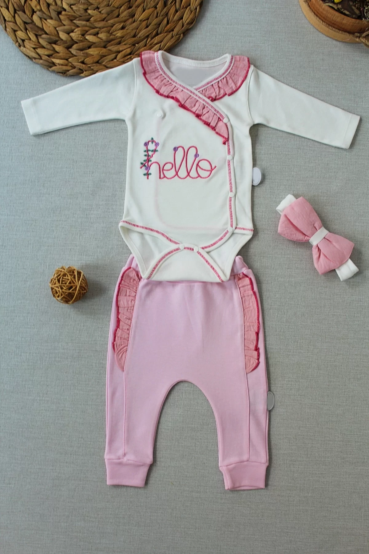 3-6 6-9 9-12 Ay Hello Nakışlı Kruvaze Bandanalı Uzun Kollu Zıbınlı 3lü Kız Bebek Takımı Pembe