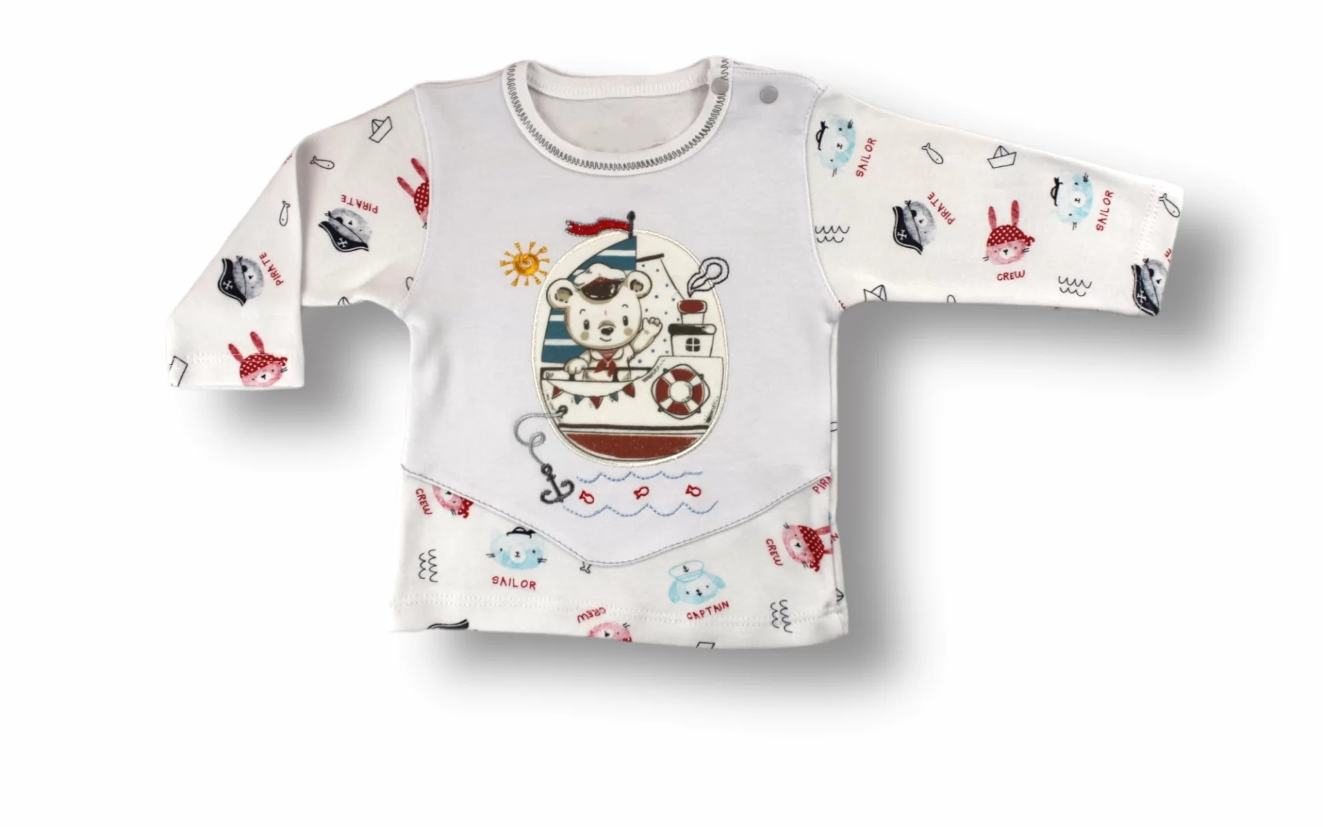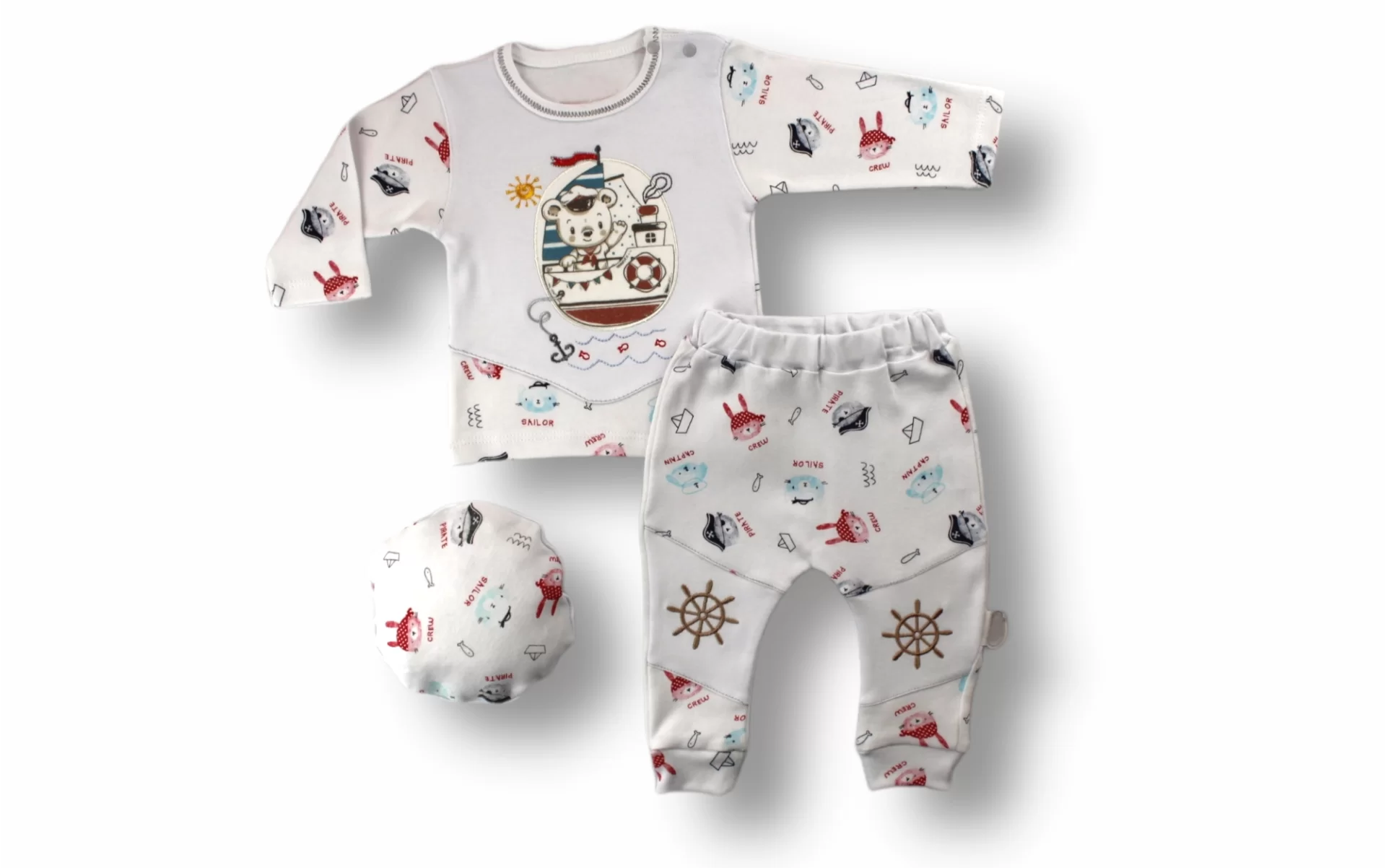 3-6 6-9 9-12 Ay Minik Korsan Nakışlı Şapkalı Uzun Kollu Sweatli 3lü Kız-erkek Bebek Takımı
