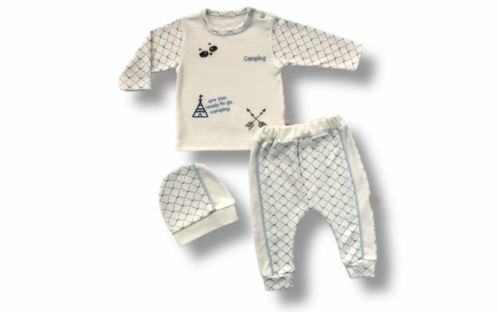 3-6 6-9 9-12 Ay My Camping Nakışlı Şapkalı Uzun Kollu Sweatli 3lü Erkek Bebek Takımı