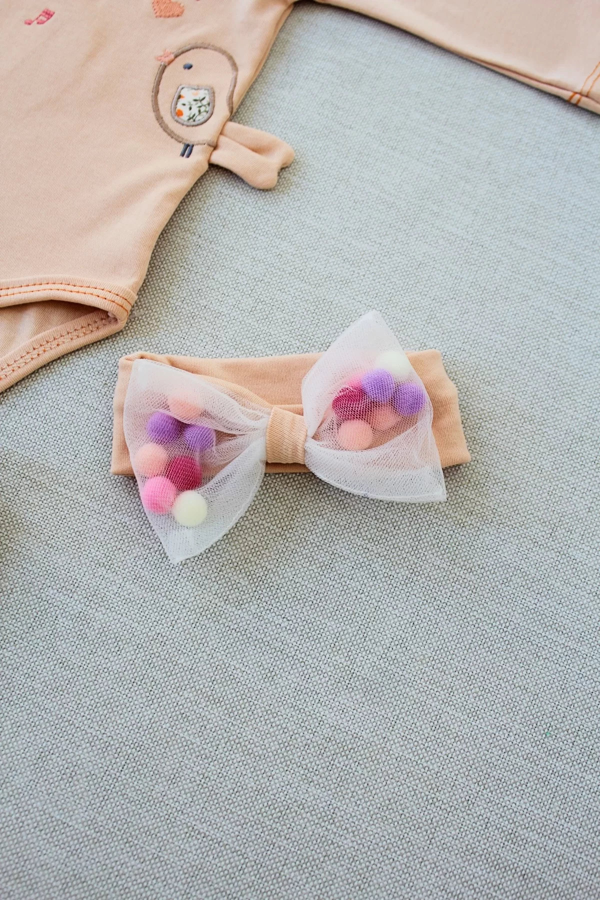 3-6 6-9 9-12 Ay Şarkıcı Kuşlar Nakışlı Bandanalı Uzun Kollu Zıbınlı 3lü Kız Bebek Takımı Buğday