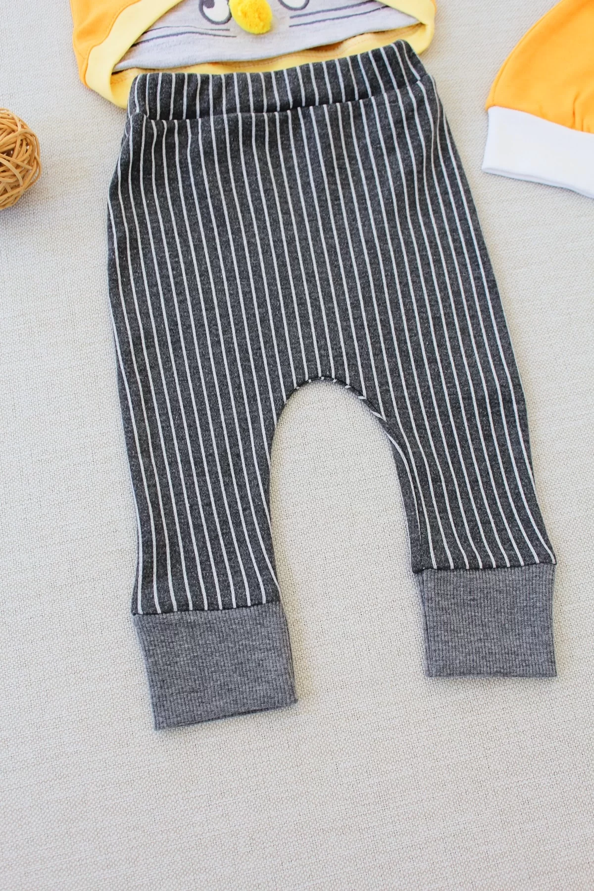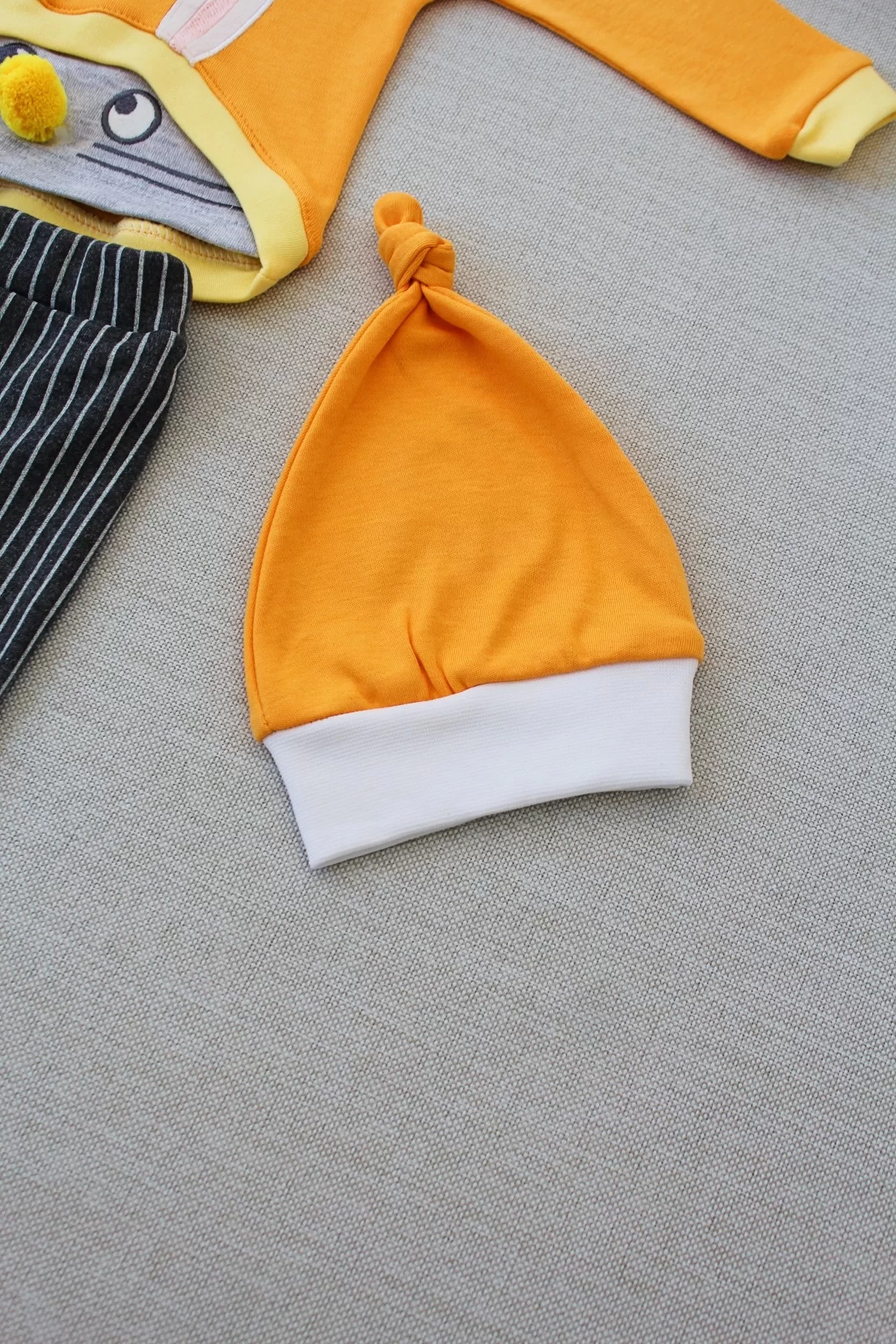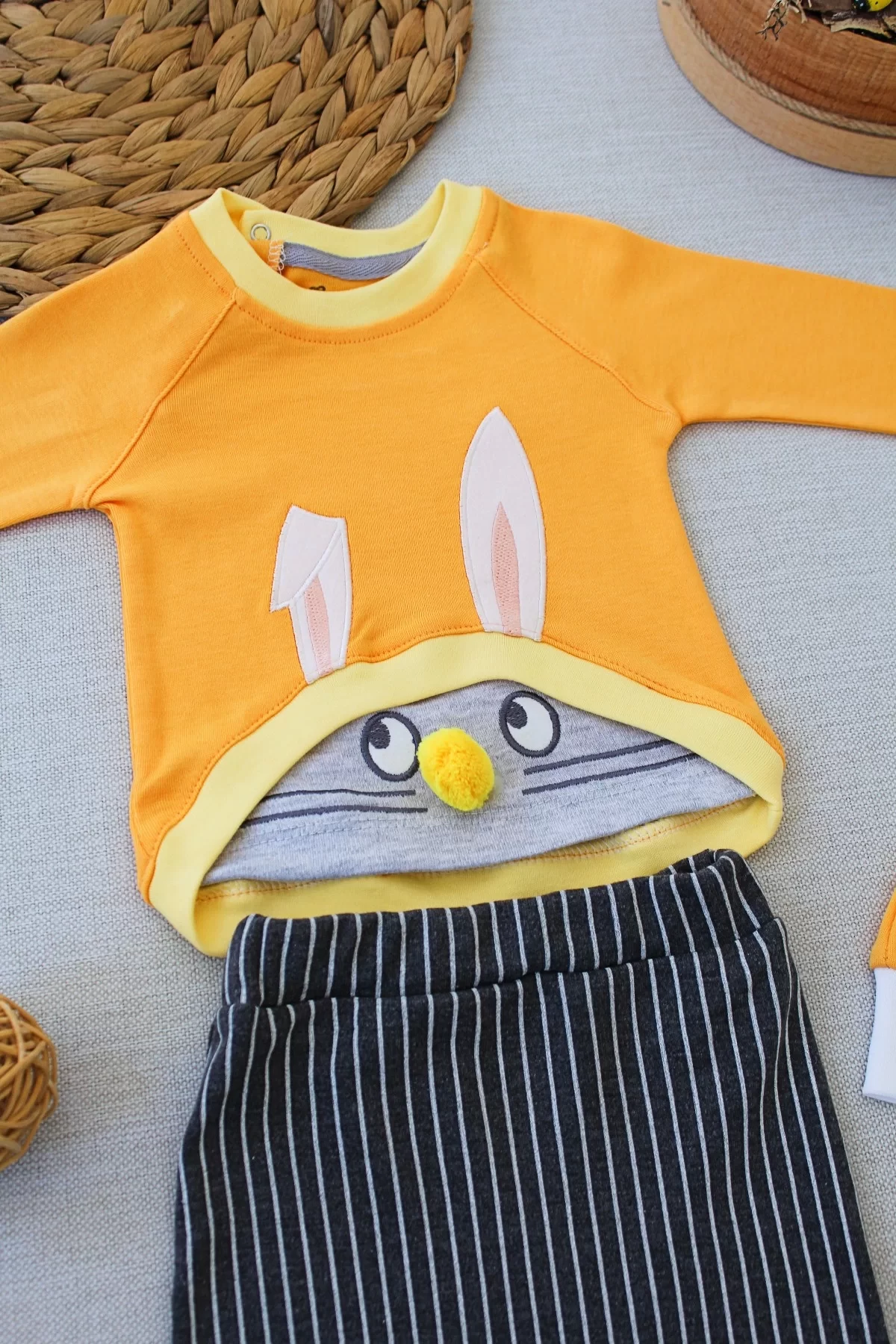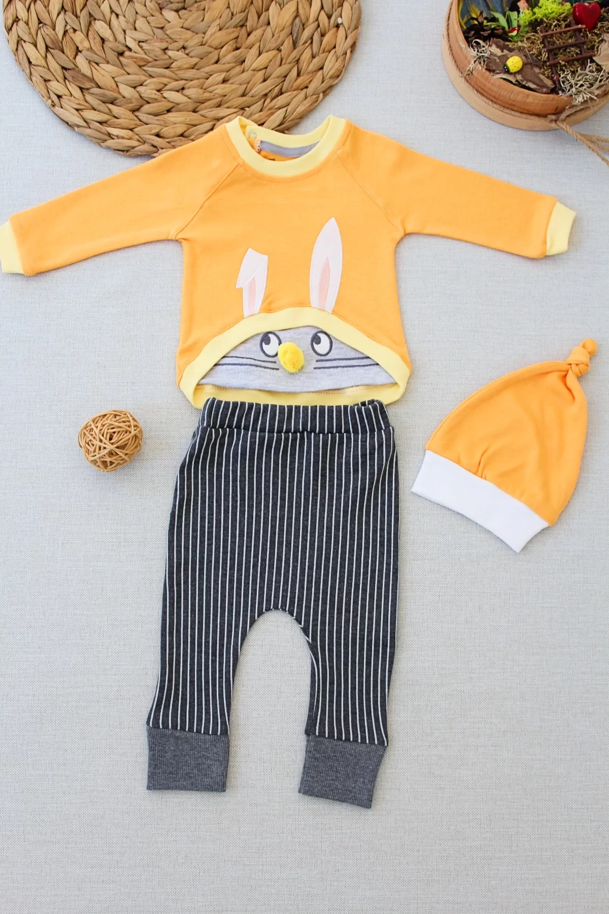 3-6 6-9 9-12 Ay Şımarık Tavşan Nakışlı Şapkalı Uzun Kollu Sweat 3lü Kız-erkek Bebek Takımı Turuncu