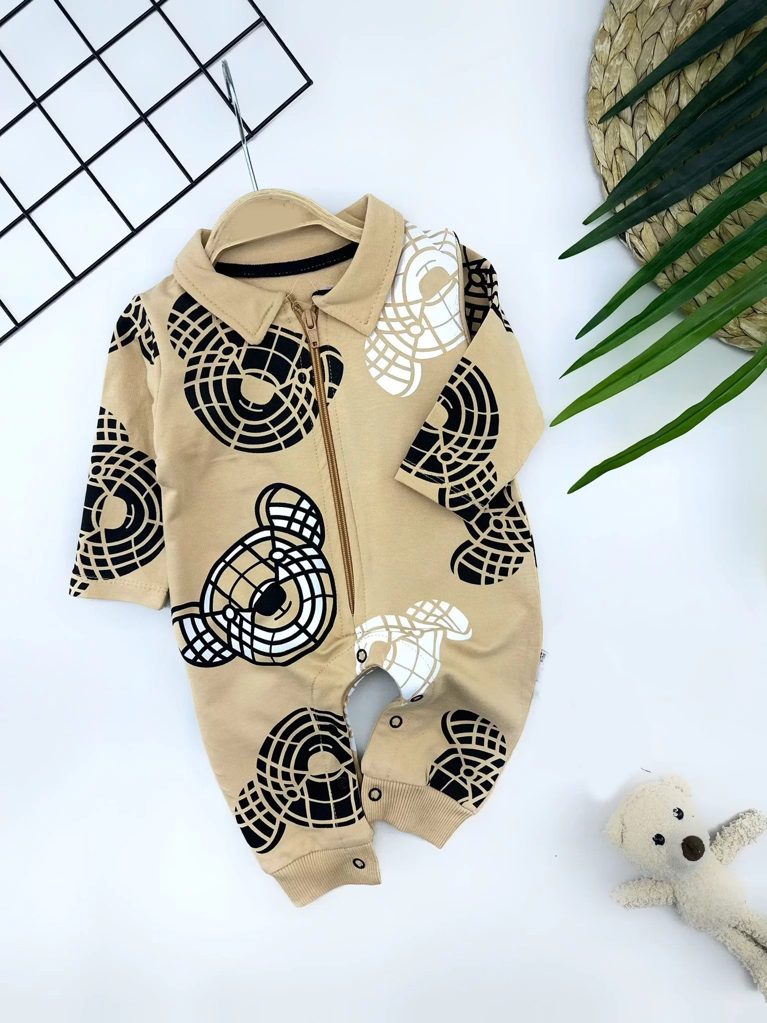 3-6-9-12 Ay Ayıcık Baskılı Boydan Fermuarlı Yakalı Uzun Kollu Kız Erkek Bebek Tulumu Bej