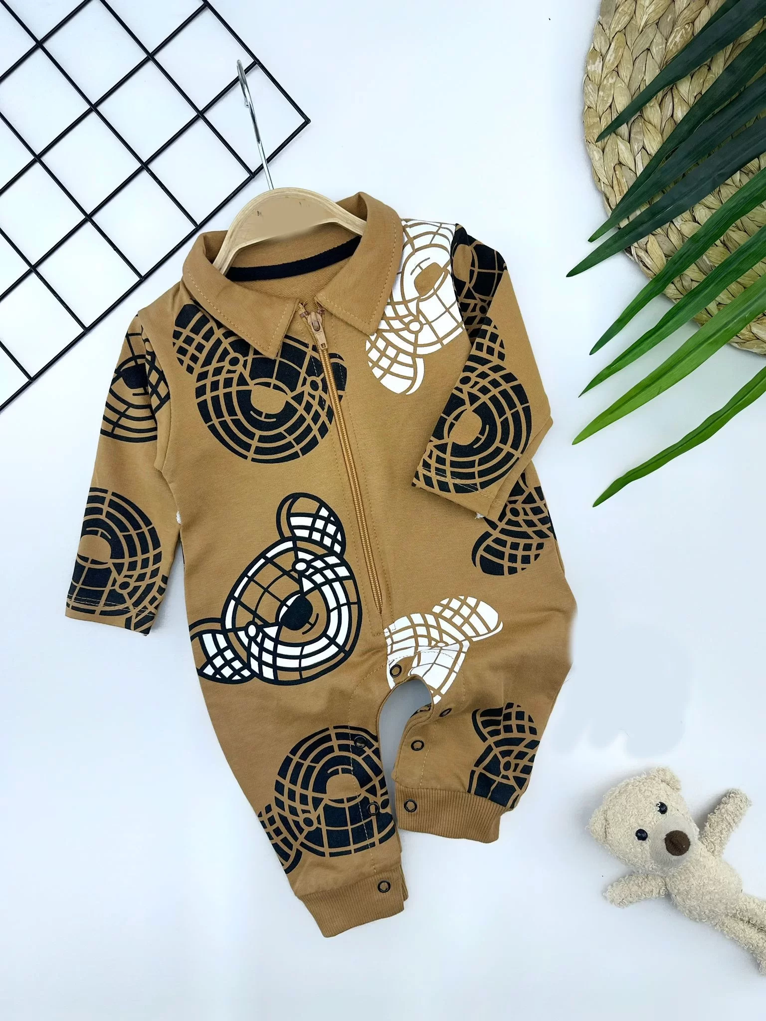 3-6-9-12 Ay Ayıcık Baskılı Boydan Fermuarlı Yakalı Uzun Kollu Kız Erkek Bebek Tulumu Kahverengi