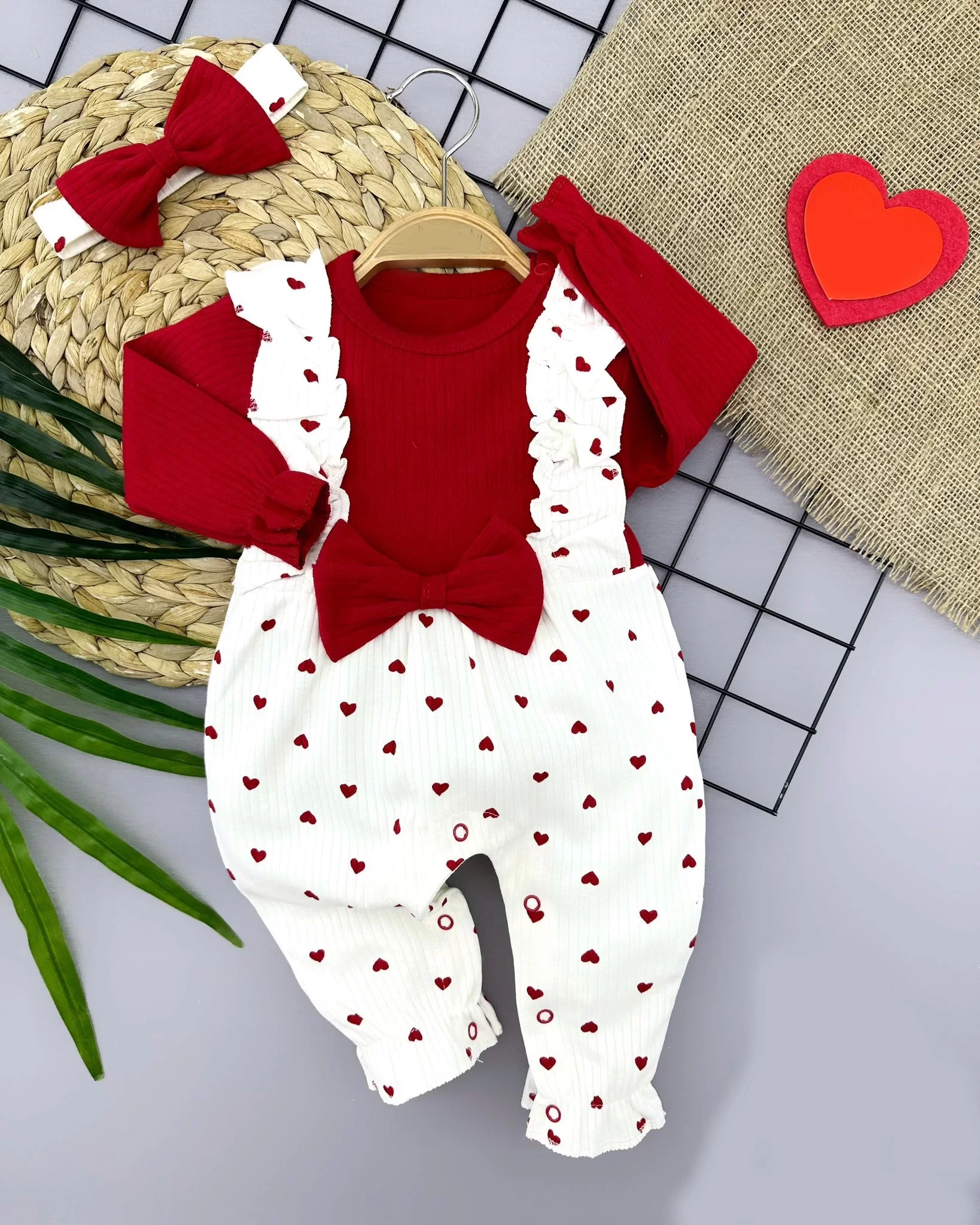 3-6-9-12 Ay Bandanalı Fiyonk Detaylı Salopet Görünümlü Kalp Desenli 2li Kız Bebek Tulumu Kırmızı