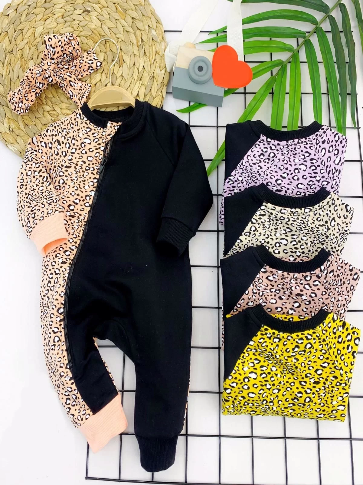 3-6-9-12 Ay Bandanalı Leopar Desenlı Fermuar Kapama Kız Bebek Tulumu Bej adet