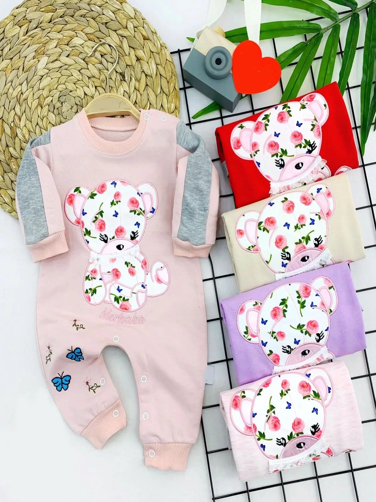 3-6-9-12 Ay Çiçekli Ayıcık Nakışlı Çıt Çıt Kapama Uzun Kollu Kız Bebek Tulumu Krem