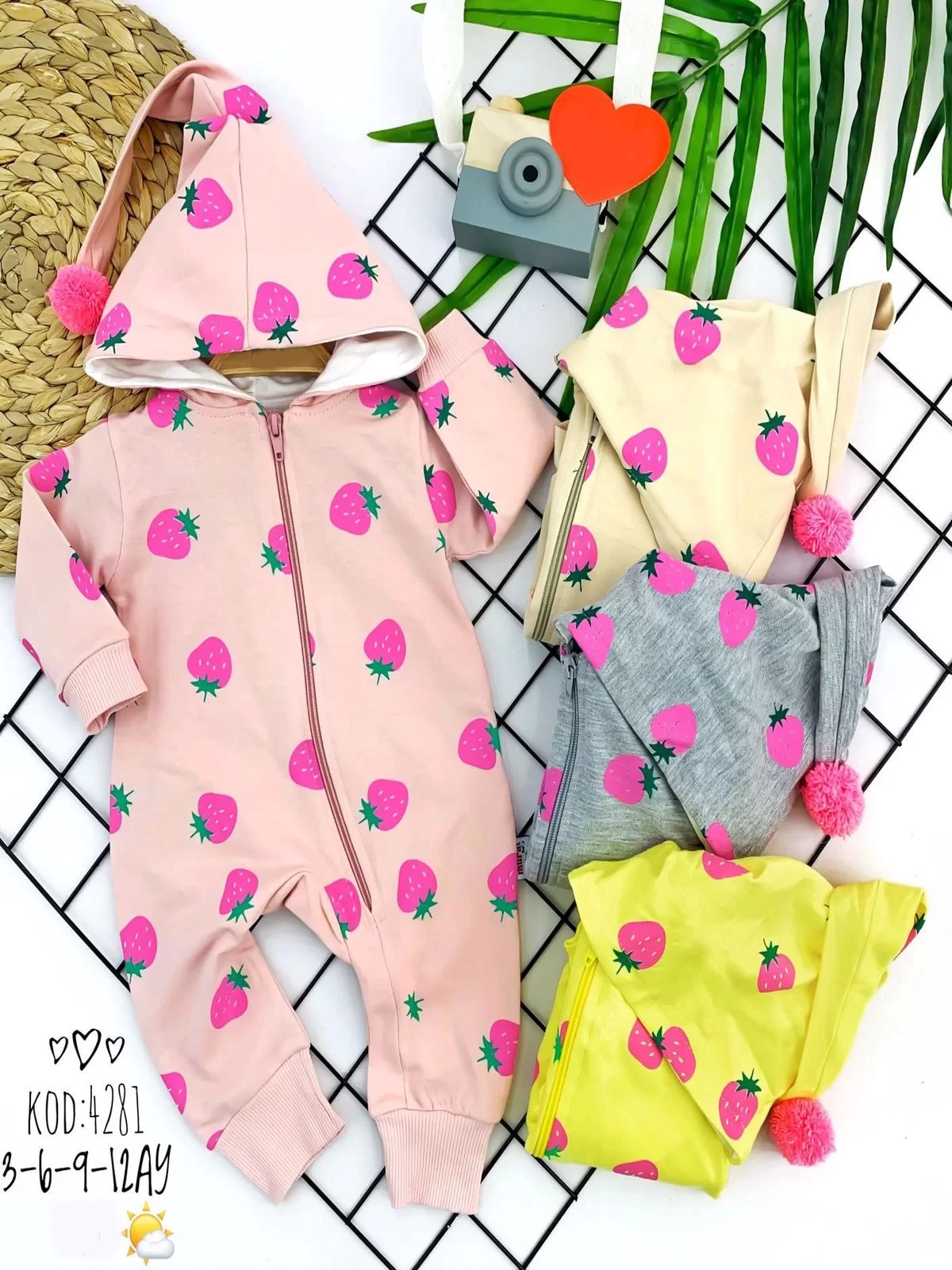 3-6-9-12 Ay Ef Boy Fermuarlı Çilek Desenli Ponpon Kapşonlu Uzun Kollu Kız Erkek Bebek Tulumu Sarı
