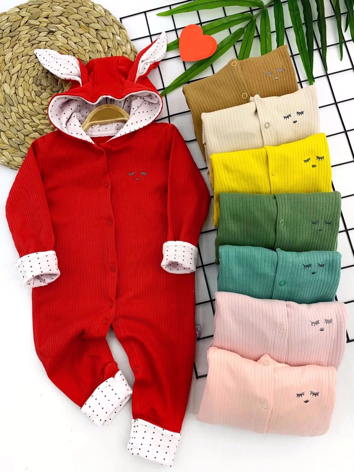 3-6-9-12 Ay Gülen Yüz Armalı Kulaklı Kapşonlu Boydan Çıtçıt Kapamalı Kız Erkek Bebek Tulumu Kırmızı