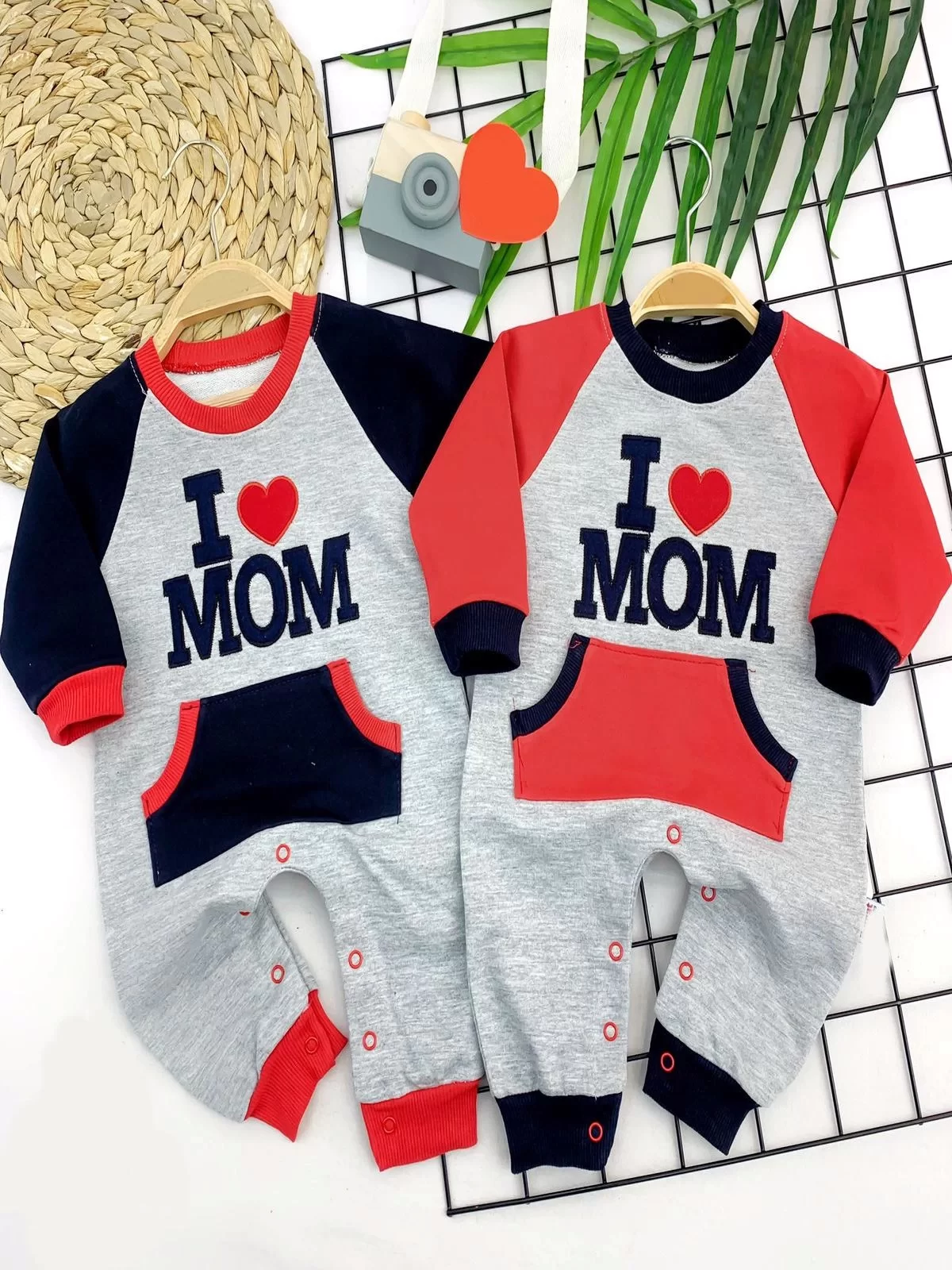 3-6-9-12 Ay I Love Mom Baskılı Cepli Kız Erkek Bebek Tulum Kırmızı adet