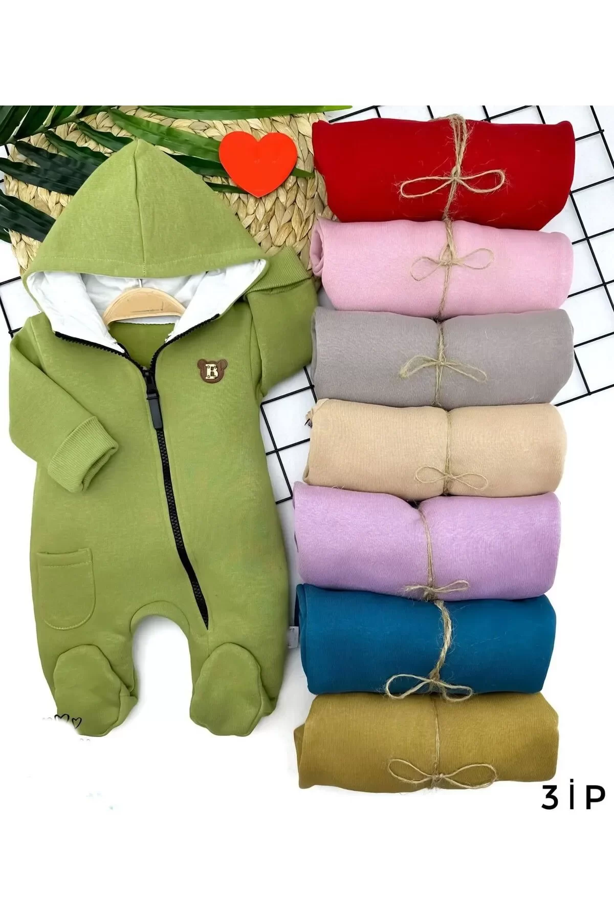 3-6-9-12 Ay Kapşonlu Ef Boy Fermuarlı Tek Cepli Ayıcık Armalı Uzun Kollu Kız Erkek Bebek Tulumu Gri