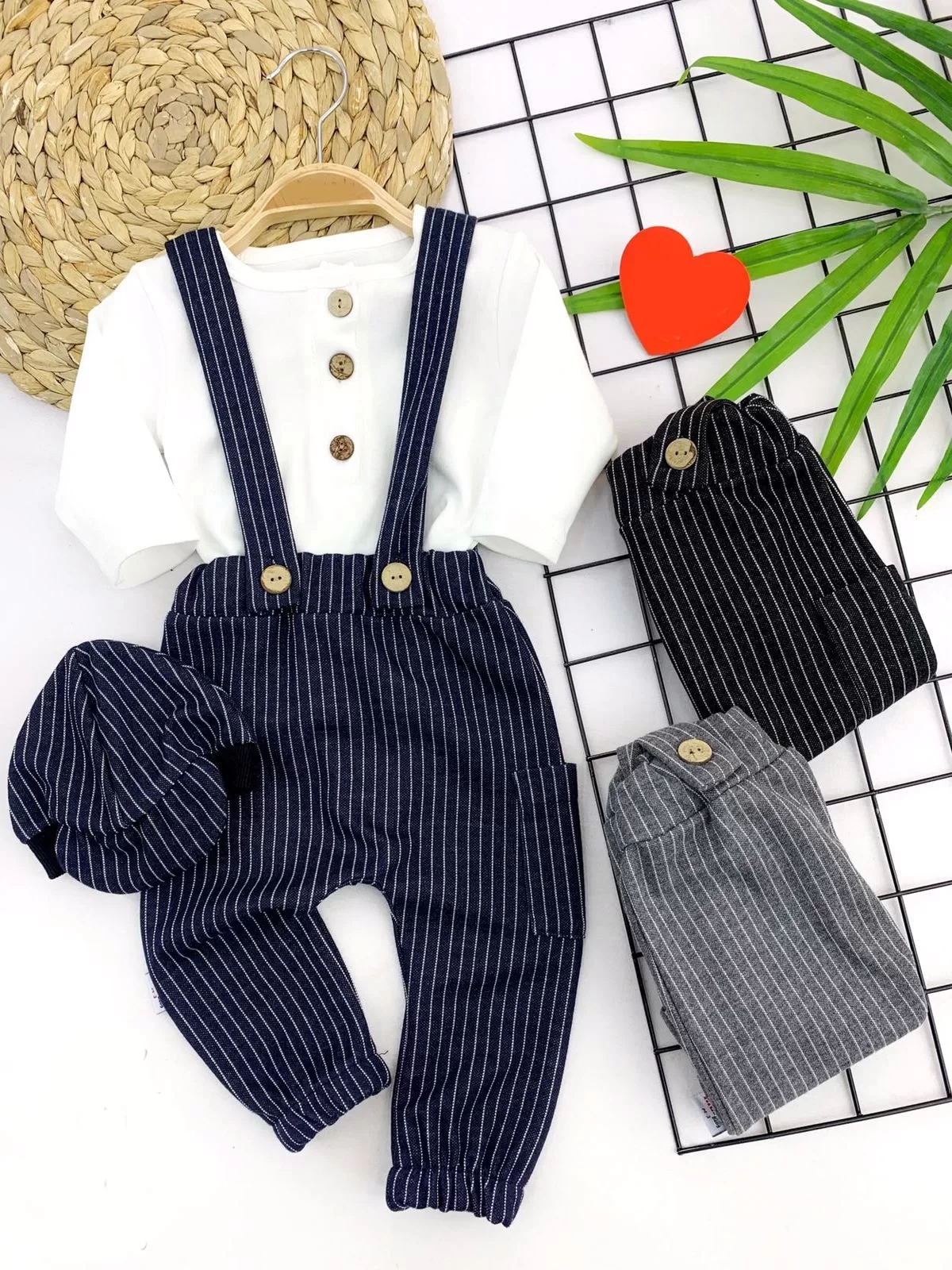 3-6-9-12 Ay Kasketli Çizgi Desenli 3lü Erkek Bebek Salopet Takımı Lacivert