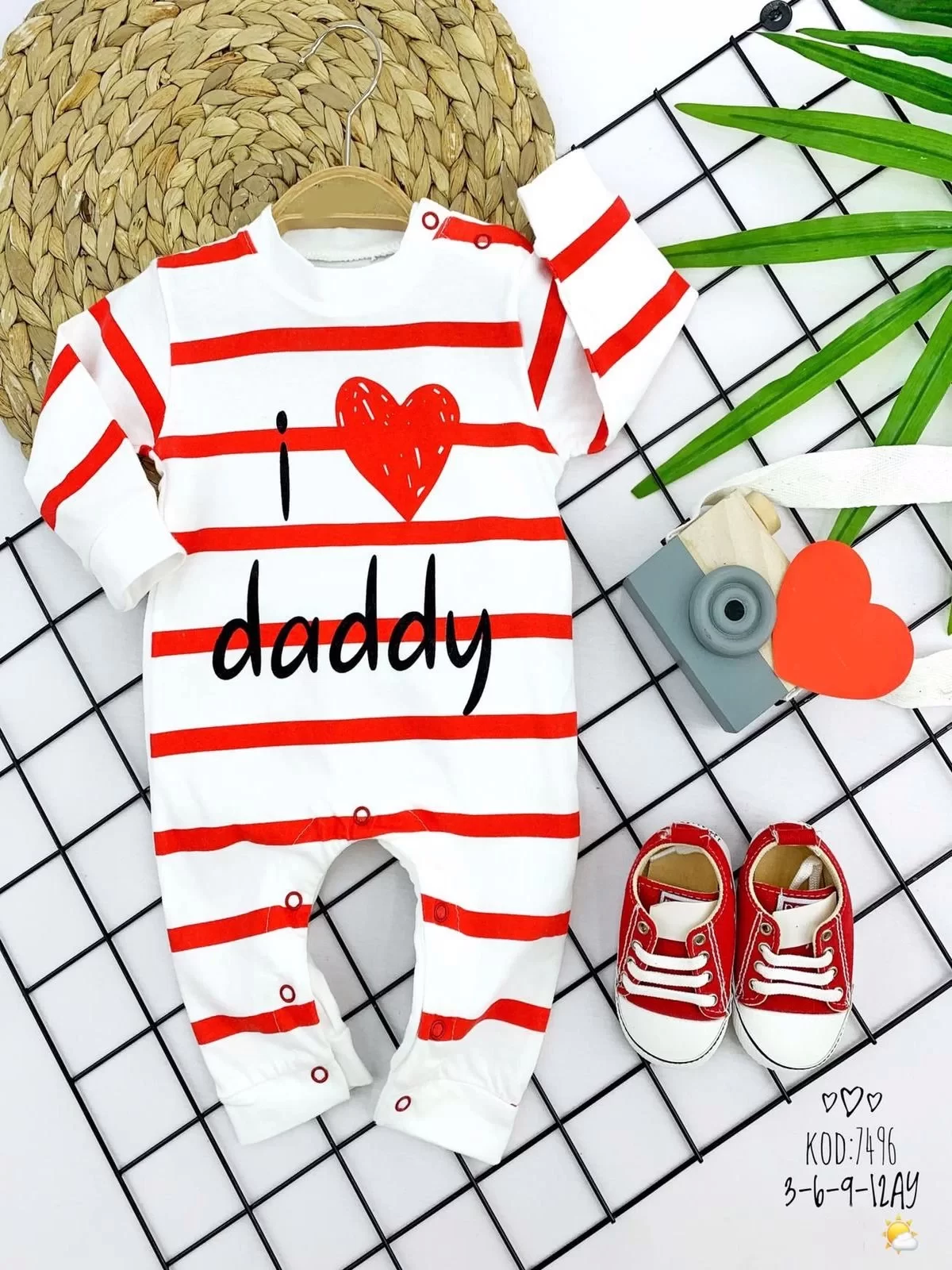 3-6-9-12 Ay Kırmızı Çizgili I Love Daddy Baskılı Uzun Kollu Kız Erkek Bebek Tulumu Beyaz