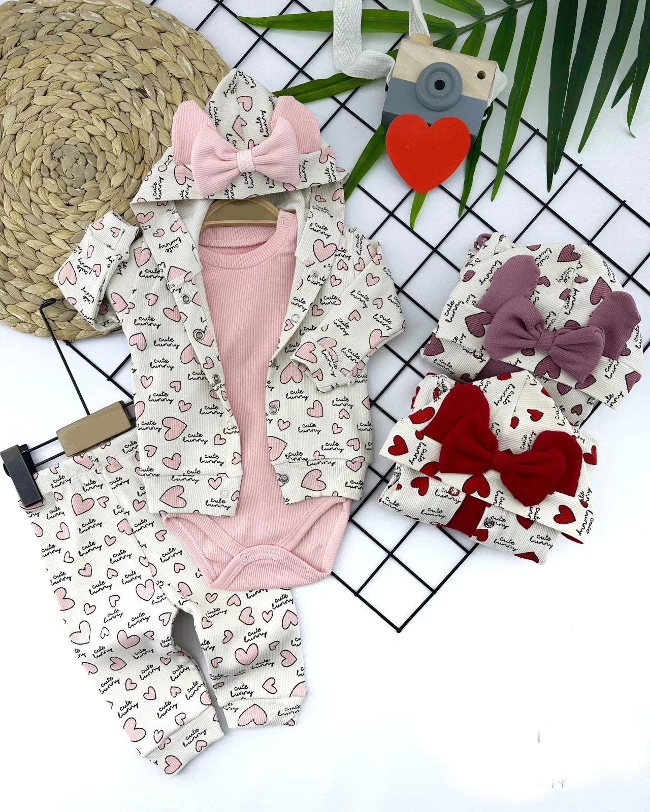 / 3-6-9-12 Ay Kulak Fiyonklu Kapşonlu Kalp Baskılı 3lü Kız Bebek Takımı Pembe