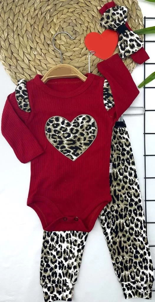 3-6-9-12 Ay Leopar Kalp Desenli Uzun Kollu Body Leopar Pantolon Bandanalı 3lü Kız Bebek Takımı Kırmızı