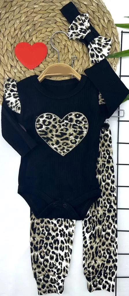 3-6-9-12 Ay Leopar Kalp Desenli Uzun Kollu Body Leopar Pantolon Bandanalı 3lü Kız Bebek Takımı Siyah