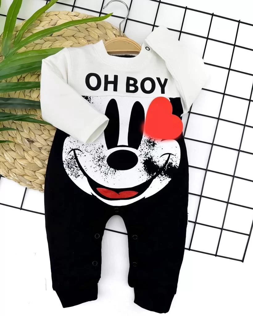 3-6-9-12 Ay Oh Boy Köpek Baskılı Uzun Kollu Erkek Bebek Tulumu