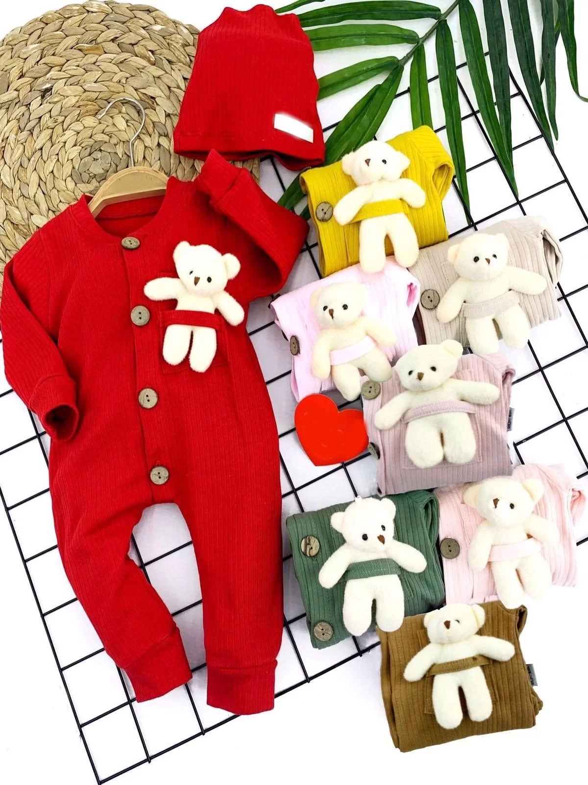 / 3-6-9-12 Ay Oyuncak Ayılı Şapkalı Düğme Kapama Kız Erkek Bebek Tulumu Kırmızı