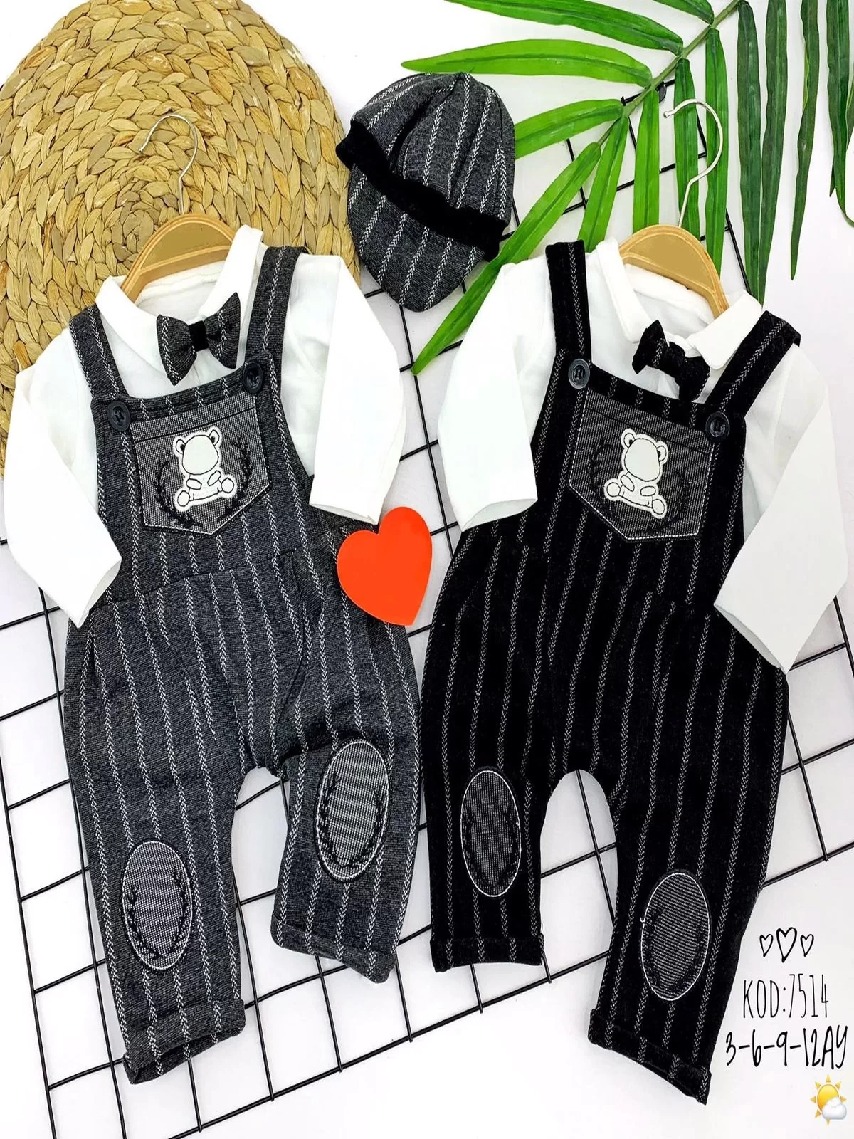 3-6-9-12 Ay Papyonlu Kasket Şapkalı Ayıcık Nakışlı 2li Erkek Bebek Salopet Takımı Gri
