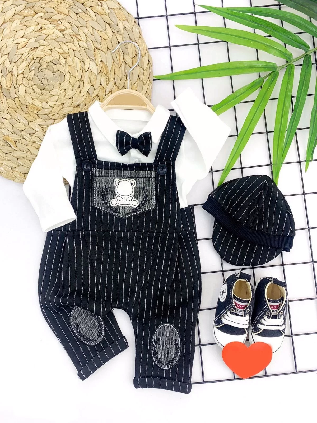 3-6-9-12 Ay Papyonlu Kasket Şapkalı Ayıcık Nakışlı 2li Erkek Bebek Salopet Takımı