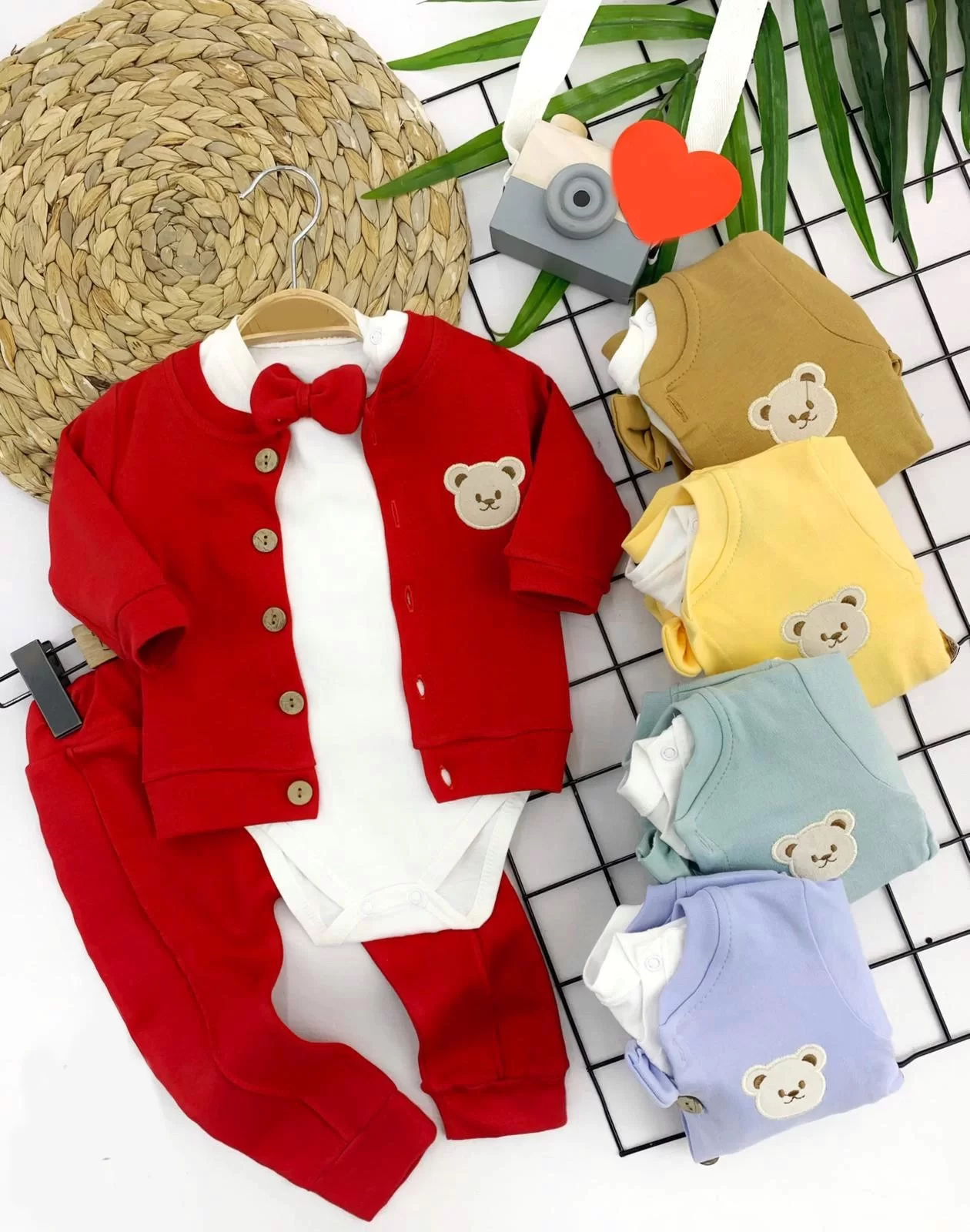 3-6-9-12 Ay Papyonlu Zıbın Düğmeli Hırkalı 3lü Kız Erkek Bebek Takımı Sarı