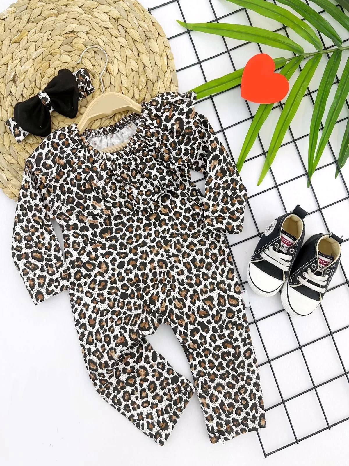 3-6-9-12 Ay Piti Leopar Desenli Fırfır Yakalı Bandanalı Uzun Kollu Kız Bebek Tulumu Kahverengi