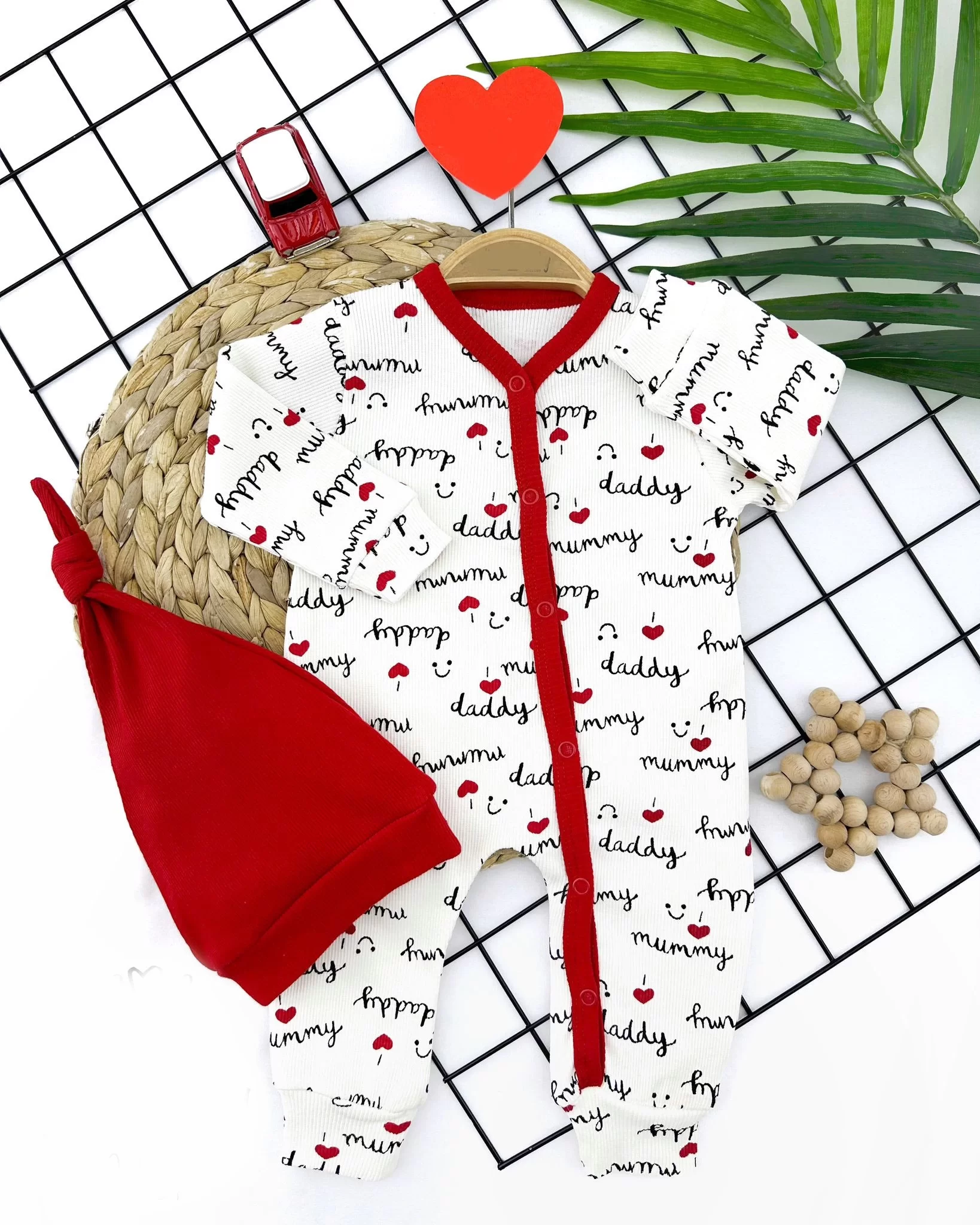 3-6-9-12 Ay Şapkalı Boydan Çıtçıtlı Yazı Baskılı 2li Kız Erkek Bebek Tulumu
