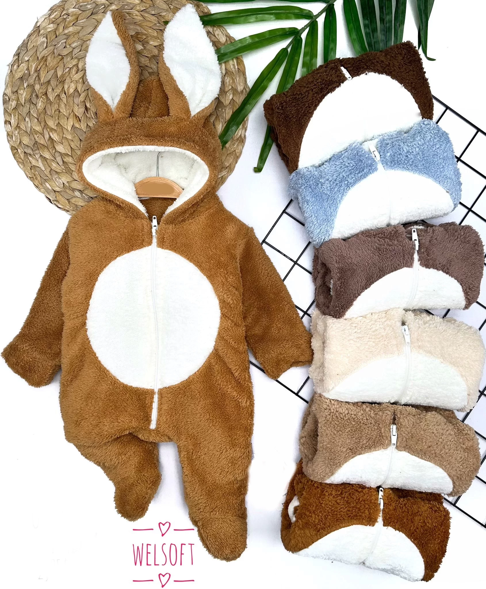 3-6-9-12 Ay Tavşan Kulak Kapşonlu Fermuar Kapamalı Patikli Eldivenli Tüylü Erkek Bebek Tulumu Hardal